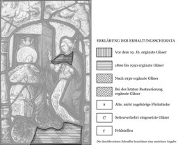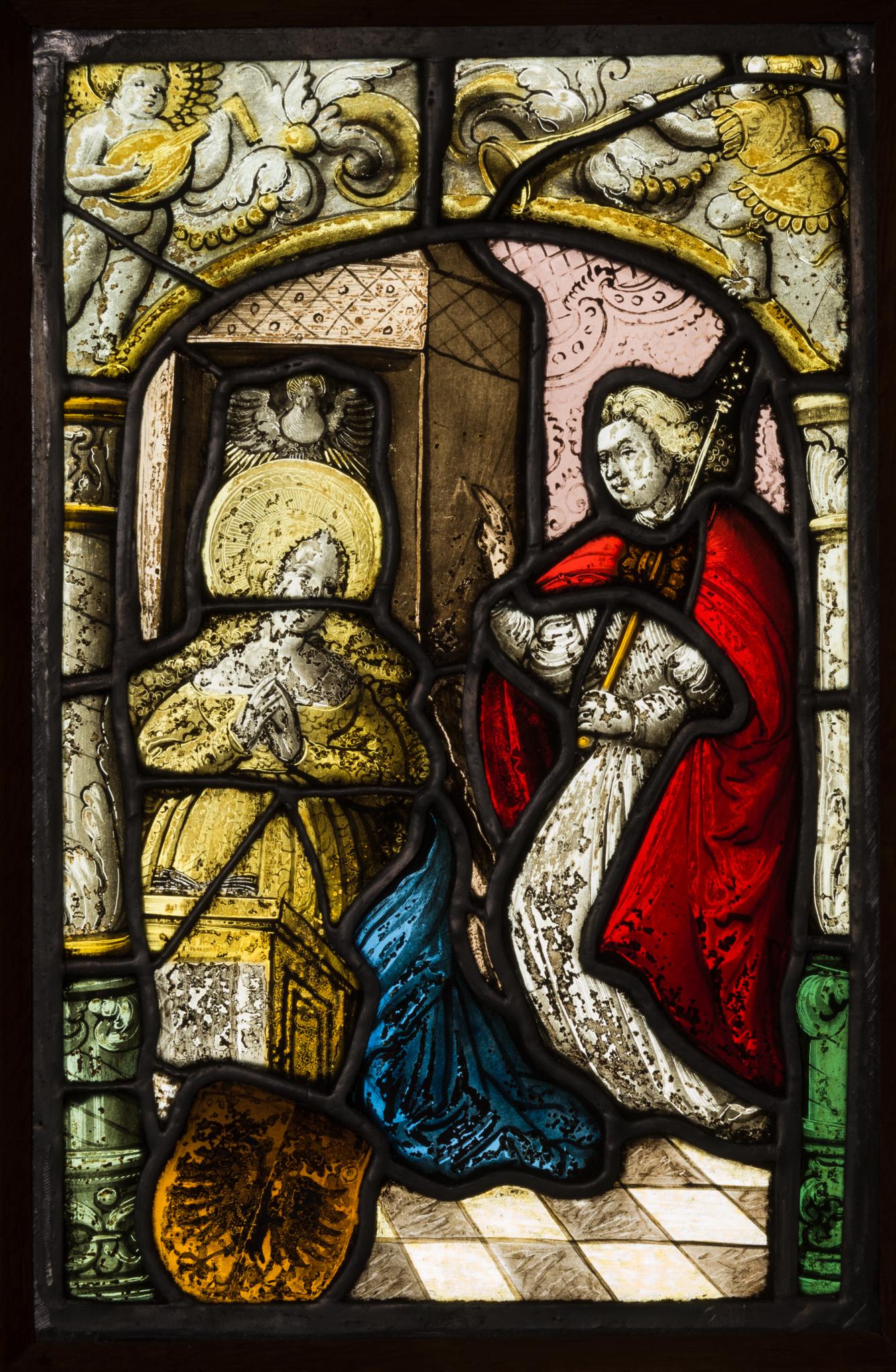 Das Hauptbild ist der Verkündigung gewidmet. Mit gefalteten Händen auf grau und weiss gefliestem Boden hinter dem Betpult kniend und von der Taube des Heiligen Geistes überhöht, wendet sich Maria Gabriel zu, der sich ihr nähert und seine rechte Hand im Segensgestus erhebt. Während die Gottesmutter in gelbem Gewand und blauem Mantel erscheint, trägt dieser über seiner weissen Kleidung einen roten Mantel. Die Szene rahmen seitlich zwei Balustersäulchen. Darüber erhebt sich ein flacher gelber Astbogen mit Blattwerk. Darauf postiert sind zwei musizierende Putten. Der am Scheibenfuss vor das Pult gesetzte unbekannte gelbe Wappenschild zeigt einen schwarzen Doppeladler.