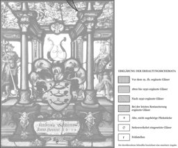 Das Vollwappen Schlumpf befindet sich im Zentrum eines perspektivisch stark verkürzten architektonischen Gehäuses, das sich vor farblosem Grund auf einem hohen blauen Podium erhebt. Zwei lachsfarbene schlanke Säulen auf roten, mit Tiermasken verzierten Postamenten stützen das zurückfluchtende rote Gebälk, das an der Rückfront auf blauen Pilastern ruht. Vor den beiden Seitenöffnungen des Gehäuses sind zwei allegorische Frauengestalten als Schildbegleiterinnen postiert. Während von diesen die Erstere in violettem Gewand, blauem Brustpanzer und Helm sowie mit einem Speer in der Hand erscheint, trägt die Letztere ein gelbes Untergewand und eine violette Tunika sowie auf dem Kopf als ihr Attribut eine Taube mit Palmzweig im Schnabel. Sie verkörpert demnach die Pax und ihr Gegenüber die Victoria. Die Tafel mit dem Stifternamen (Flickstück) ist unten am Podium zwischen den Säulenpostamenten platziert. Im Oberbild sind in offener Landschaft Reiter mit ihren Gehilfen und Hunden bei der Hirsch und Rehjagd dargestellt.