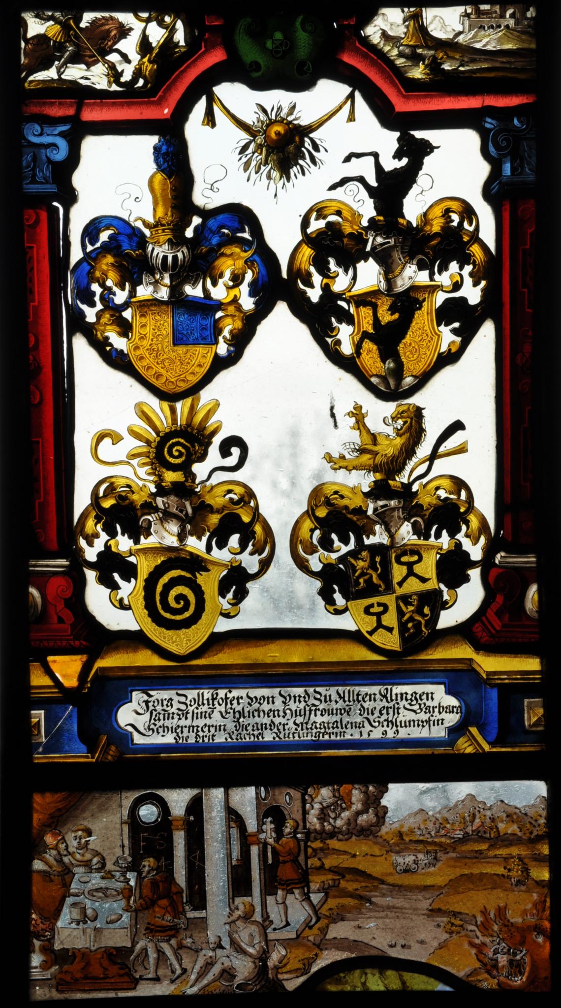Allianzwappenscheibe Georg II. Zollikofer, Barbara Schirmer, Magdalena Schlumpf und Rahel (Rachel) Reutlinger