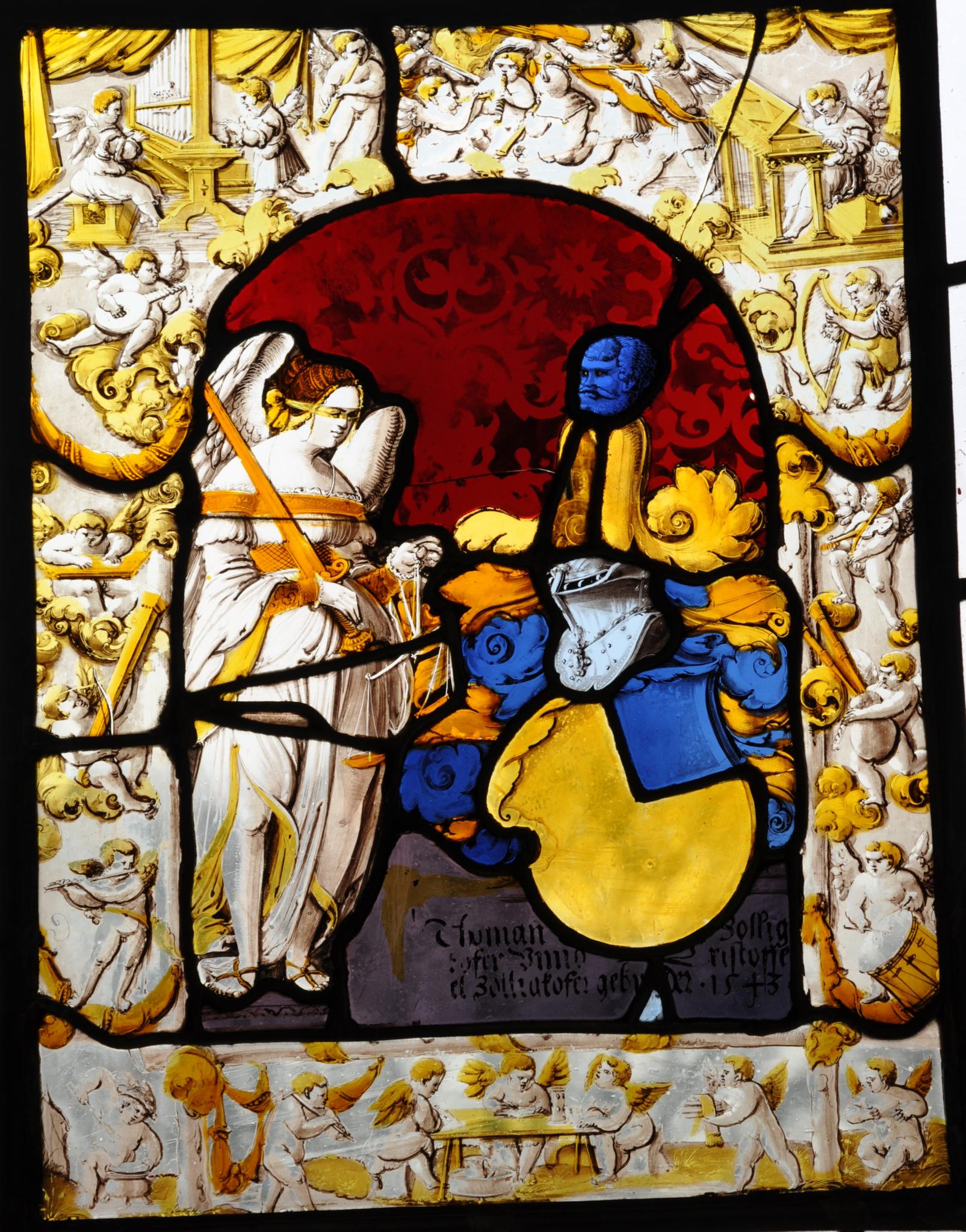 Das Vollwappen der Brüder Thomas und Christoph Zollikofer befindet sich vor rotem Damastgrund über dem violetten, die Stifternamen enthaltenden Grund. Begleitet wird es von der geflügelten, in ein langes weisses Gewand gekleideten Justitia, die mit verbundenen Augen Richtschwert und Waage in ihren Händen hält. Figur und Wappen umfasst ein mit gelben Blättern belegter Astbogen, der auf einem Sockel steht. Das ganze Bogen- und Sockelfeld ist mit Putten bevölkert, die mit Orgel, Klavizimbel, Harfen, Flöten, Trommel, Pfeifen, Geigen und Dudelsack musizieren.
