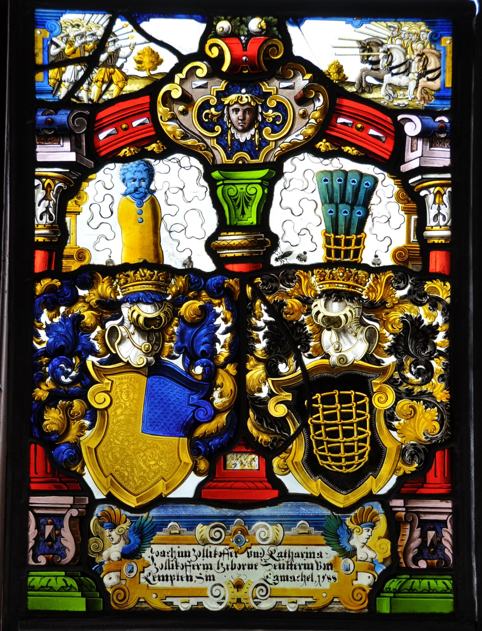 Die Vollwappen Joachim Zollikofers und Katharina Seuters sind vor farblosem, schnurverziertem Grund auf das blaue Podium am Scheibenfuss gestellt. Vor diesem befindet sich die Stifterinschrift in einer gelben, mit zwei barbusigen, geflügelten Wesen dekorierten Rollwerkkartusche. Hinter den Schilden erhebt sich eine zweiachsige Rahmenarchitektur aus roten Rundpfeilern und einem roten Flachbogen mit einer grossen, maskengeschmückten Scheitelkartusche. Das durch die Kartusche in zwei Felder unterteilte Oberbild zeigt ein Reiterheer, das gegen eine es unter Beschuss nehmende Truppe von Fusssoldaten anstürmt. Über der Helmdecke des Wappens Seuter ist im weissen Grund eine Fliege als Trompe-l'œil festgehalten.