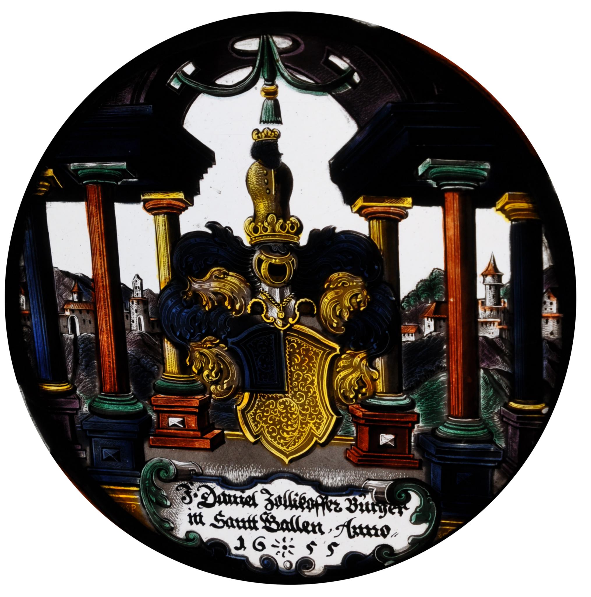 Das Vollwappen Daniel Zollikofers befindet sich im Zentrum einer luftigen, mehrfarbigen Pfeilerarchitektur, die den Blick auf eine Stadtanlage im hügeligen Gelände freigibt. Unter dem Wappenschild ist der Stiftername in einer grünen Rollwerkkartusche angebracht.