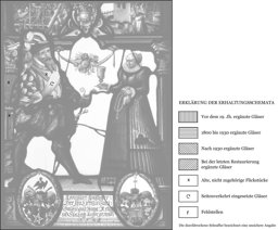 Die Willkommscheibe zeigt das auf dem Podium stehende Stifterpaar. Der die Gewehrgabel in der linken Hand haltende bärtige Mann erscheint in gelbem Wams, einem geschlitzten schwarzen Hemd, hellroten Pluderhosen, roten Strümpfen und einem Federbarett. Um den Hals trägt er eine goldene Kette und um die Brust eine weisse Schärpe. Seine Gemahlin, die ihm in der Rechten den Pokal mit dem Willkommtrunk darreicht und in der Linken ihre Handschuhe hält, trägt eine Haube, ein violettes Mieder, einen langen grünen Rock mit breitem rotem Streifen sowie eine Schürze. An ihrem Gurt festgebunden sind Beutel und Essbesteck. Die beiden vor farblosen Grund gesetzten Figuren umfasst eine einfache rote Säulenrahmung mit eingezogenem Bogen, an dessen Scheitel sich eine grosse, kopfgeschmückte Kartusche befindet und von dem ein Fruchtbouquet an einem Feston herabhängt. Die Stifterinschrift an der Podiumsfront am Scheibenfuss wird seitlich von den oval umkränzten Vollwappen Leonhart Lolbachers und Anna Retichs flankiert. In dem durch die Scheitelkartusche in zwei Felder unterteilten Oberbild sind Bauern bei der Weinlese sowie ein weiterer Bauer, der mit dem Traubenkorb am Rücken eine Frau umarmt, zu sehen.