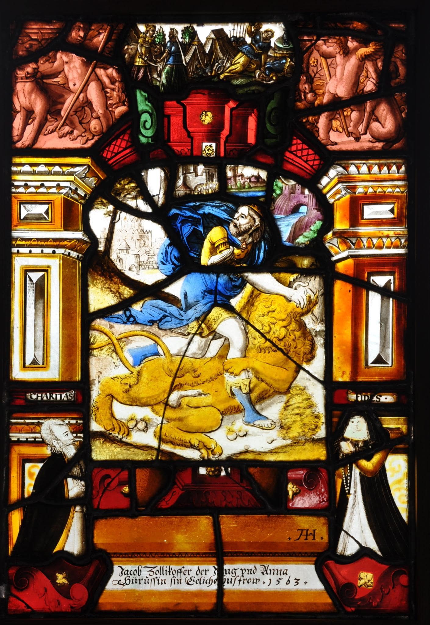 Die aus Fragmenten mehrerer Scheiben zusammengestückte Komposition zeigt als Hauptmotiv Samsons Löwenkampf (Ri 14, 5f.), den seitlich monumentale Pilaster rahmen. Darunter erscheint in den Bildecken ein kniendes Stifterpaar mit gefalteten Händen. Beide Figuren tragen über ihrer weissen Gewandung einen schwarzen Mantel. Die Frau hält in ihren betenden Händen zudem einen Rosenkranz (ihr Haupt ist ein Flickstück). Das Podium zwischen den Figuren enthält die Stifternamen von Jakob Zollikofer und Anna Hürus sowie das Monogramm Andreas Hörs. Die oberen Bildecken füllen zwei rosa Gläser, auf denen beiden ein Putto mit Hund dargestellt ist. Das zwei Weiberlisten thematisierende Figurenbild dazwischen schildert, wie Judith ihrer Dienerin das Haupt von Holofernes überreicht (Jdt 13), und wie Jahel dem Sisera den Zeltpflock in den Schädel schlägt (Ri 4, 17–21).