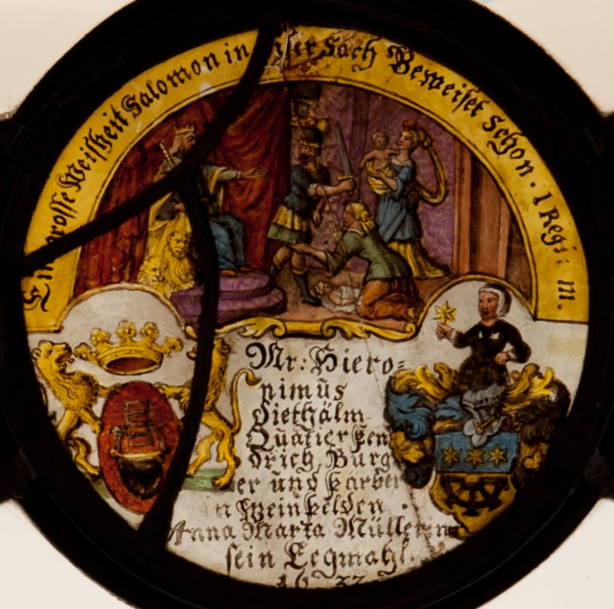 TG_221: Runde Bildscheibe Hieronymus Diethelm und Anna Maria Müller mit Urteil Salomons