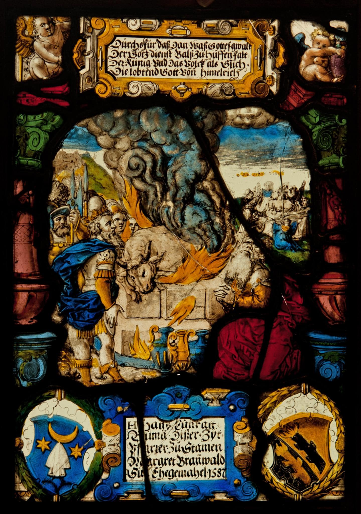 Im Hauptbild ist die im Buch der Könige geschilderte Geschichte des vom Propheten Elias initiierten Opfers der Stiere festgehalten (1 Kg 18, 21–46). Als Elias sah, dass sein Volk nicht mehr dem Herrn, sondern dem Baal huldigte, forderte er die Baalspriester auf, ihrem Gott einen Stier als Opfer vorzubereiten. Nachdem auch er für seinen Herrn ein solches Opfer auf einem Steinalter bereit gestellt hatte, prophezeite er, dass sich als wahrer Gott derjenige zu erkennen gebe, welcher auf das ihm dargebrachte Opfer mit Feuer antworte. Die Darstellung zeigt den in einen roten Mantel gehüllten Elias im Moment der Anrufung seines Herrn, der den Stier auf den für ihn errichteten Altar in Flammen aufgehen lässt. Hinter Elias sind die um ihren Altar versammelten Baalspriester zu sehen, welche die Feuerantwort ihres Gottes vergeblich erwarten. Die Figurenszene umfasst eine Rahmenarkade aus rosa Balustersäulen und einem Flachbogen, an dessen Scheitel die Bildlegende in einer von zwei sitzenden Putten begleiteten, gelben Rollwerkkartusche angebracht ist. Die Stifternamen befinden sich in der blauen Rollwerkkartusche am Scheibenfuss. Seitlich davon erscheinen in ovalen Lorbeerkränzen die Wappen von Hans Konrad Baumann und Margaretha Brennwald.