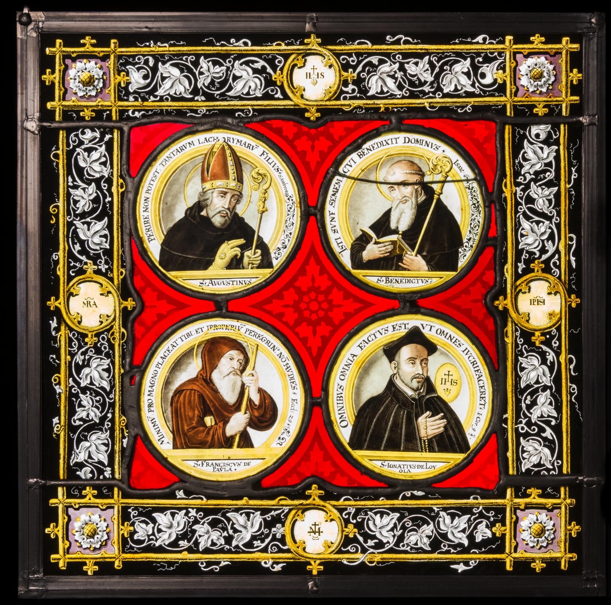 Die vier Heiligen erscheinen in den Medaillons als Halbfiguren, Augustinus (354–430) in Pontifikaltracht, Benedikt (480–547) mit Buch und Pedum in schwarzem Habit, Franz von Paula (1416–1507), der Gründer des Paulanerordens, mit Buch und Wanderstab in dessen Tracht sowie Ignatius von Loyola (1491–1556) mit dem Rosenkranz in schwarzem Mantel und Birett. Jeden der vier Heilige umfasst ein biblischer Spruch.