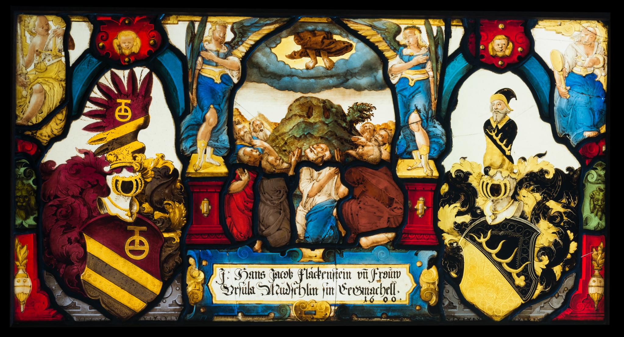 Die längsrechteckige, durch eine Arkatur dreigeteilte Scheibe zeigt im zentralen Feld die Himmelfahrt Christi und darunter die Stifternamen in einer Rollwerkkartusche. Der die Himmelfahrtsszene rahmenden Arkade sind zwei Engel in blauen Kleidern vorgesetzt, die auf hohen roten Postamenten stehen und mit ihren ausgebreiteten Innenflügeln das Figurenbild bogenförmig krönen. In den zwei Aussenarkaden erscheinen vor farblosem Grund die Vollwappen des Stifterehepaares unter einem blauen Bogen mit roter, engelskopfgeschmückter Scheitelkartusche. In den oberen Zwickeln befinden sich zwei sitzende weibliche Tugendgestalten. Es handelt sich um die Justitia mit Richtschwert und Waage (links) sowie um die Prudentia mit Spiegel und Schlange (rechts).