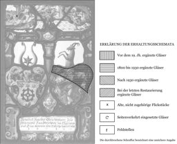 Ein altes Flickstück links aussen im Oberbild; eine neue Ergänzung (Helm und Helmdeckenteil des Frauenwappens); einige Sprünge und Sprungbleie; die Verbleiung erneuert.