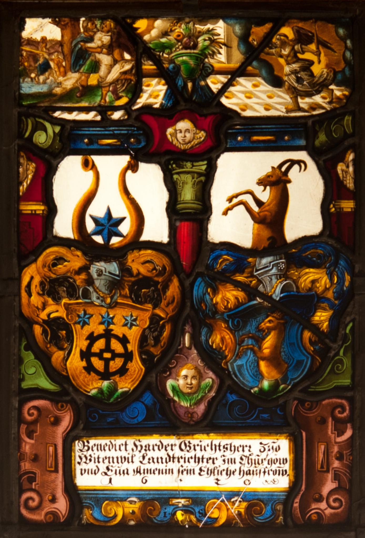 Johann Benedikt Harder († 1675) aus Konstanz war Gerichtsherr von Wittenwil, Landrichter im Thurgau und von 1636–1652 Gerichtsherrenschreiber. Um 1620 kam er durch Heirat mit Eva Ammann (†1638) in den Besitz des Schlosses und der Herrschaft Wittenwil (Giger 1993, S. 59). 1656 liess er das Schloss Wittenwil, welches einem Brand zum Opfer gefallen war, wieder aufbauen und stattete es mit einer katholischen Kapelle aus (Knoepfli 1950, S. 447f.). Von dort stammt das Epitaph des Stifterehepaars, das sich heute in der Vorhalle der Klosterkirche Fischingen befindet (Knoepfli, 1955, S. 124; Knoepfli, 1950, S. 448; Ammann, 1933, 29–30).