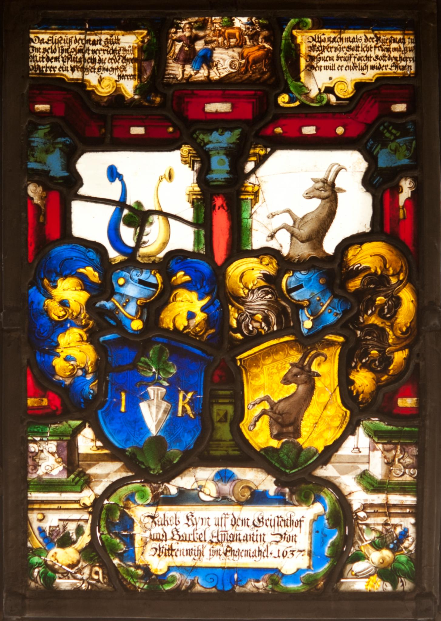 Die Vollwappen des Stifterpaares sind vor farblosem Grund über die Rollwerkkartusche mit der Stifterinschrift gesetzt. Dahinter erhebt sich eine zweiachsige Rahmenarchitektur mit rotem Gebälkabschluss. Darüber befindet sich eine lange, auf den pflügenden, zum Propheten erhobenen Elisa (Elisäus) anspielende Bildlegende (1. Buch Könige 19, 19), die im Zentrum durch die darauf bezügliche Darstellung unterbrochen wird.