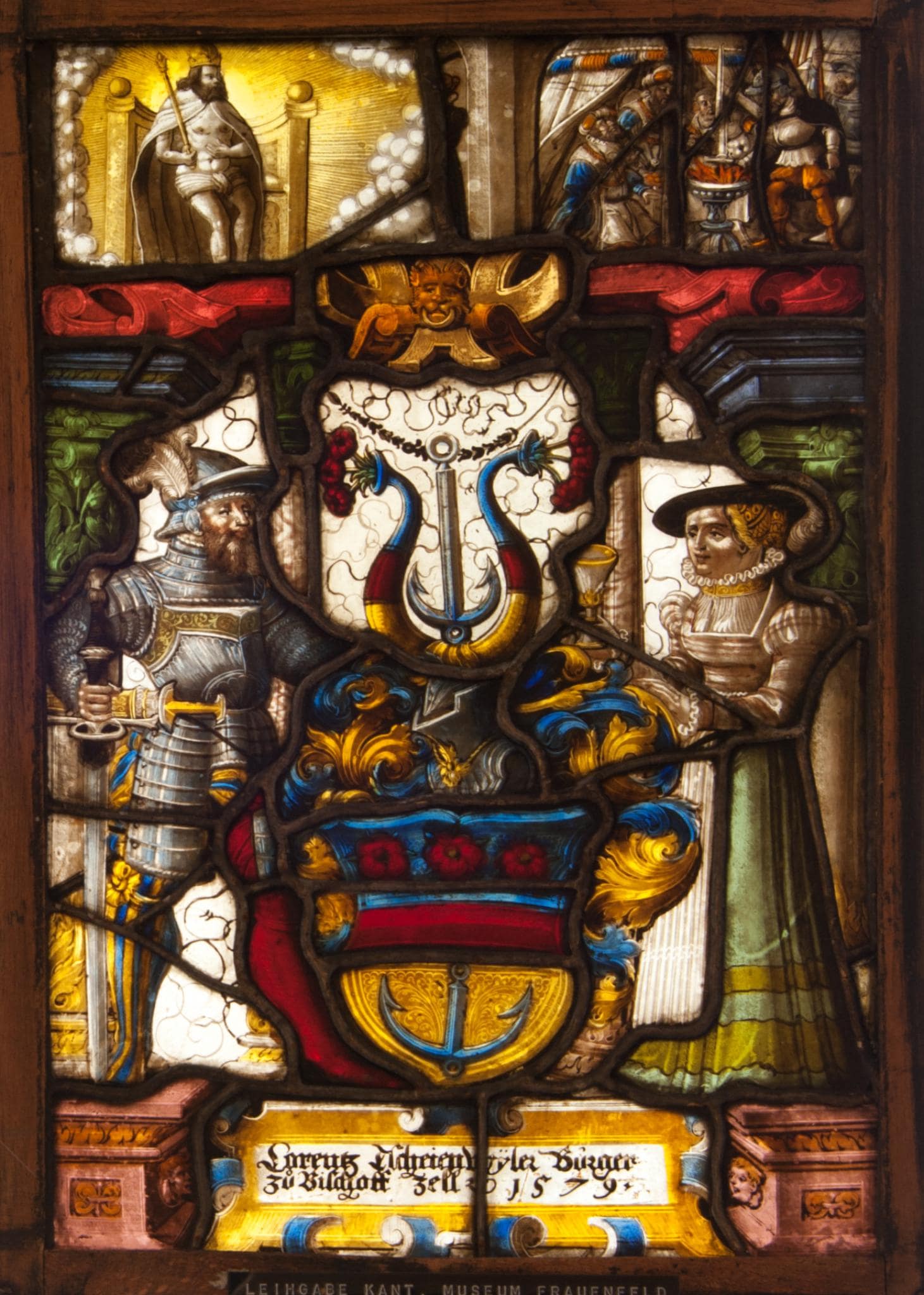 Das Vollwappen Laurenz Schewilers ist vor farblosem, schnurverziertem Grund auf die Rollwerkkartusche mit dessen Namen gesetzt. Links davon steht der in einen Halbharnisch und gefiederten Helm gekleidete Scheibenstifter. Einen Schweizerdolch am Gürtel tragend, umfasst er mit seiner Rechten einen Zweihänder, während er mit der Linken seinen Schild hält. Den Blick richtet er auf seine Gemahlin, die in grünem Rock, weisser Schürze und schwarzem Hut auf der gegenüberliegenden Seite dargestellt ist und ihm in ihrer Rechten den Willkommtrunk in einem Pokal anbietet. Hinter Figuren und Wappenschild erheben sich vier Säulen als Träger eines roten, aus Rollwerk gebildeten Gebälks, dessen Zentrum eine Löwenmaske ziert. Das zweigeteilte Oberbild zeigt im rechten Teil den Römerhelden Mucius Scaevola, der sich vor König Porsenna zum Zeichen seiner Unerschrockenheit die Hand verbrennt, nachdem er aus Versehen nicht diesen, sondern dessen Schreiber erdolcht hatte. Die linke Oberbildszene mit dem gekrönten, nur in ein Lendentuch und einen Mantel gehüllten König auf dem Thron (Christus?) ist ein altes Flickstück. Nach der Aufnahme in Hans Lehmanns Sudeley-Katalog von 1911 war an dessen statt ursprünglich ein weiterer Römerheld zu sehen, nämlich Marcus Curtius, der sich zu Pferd in den feuerspeienden Schlund stürzt.