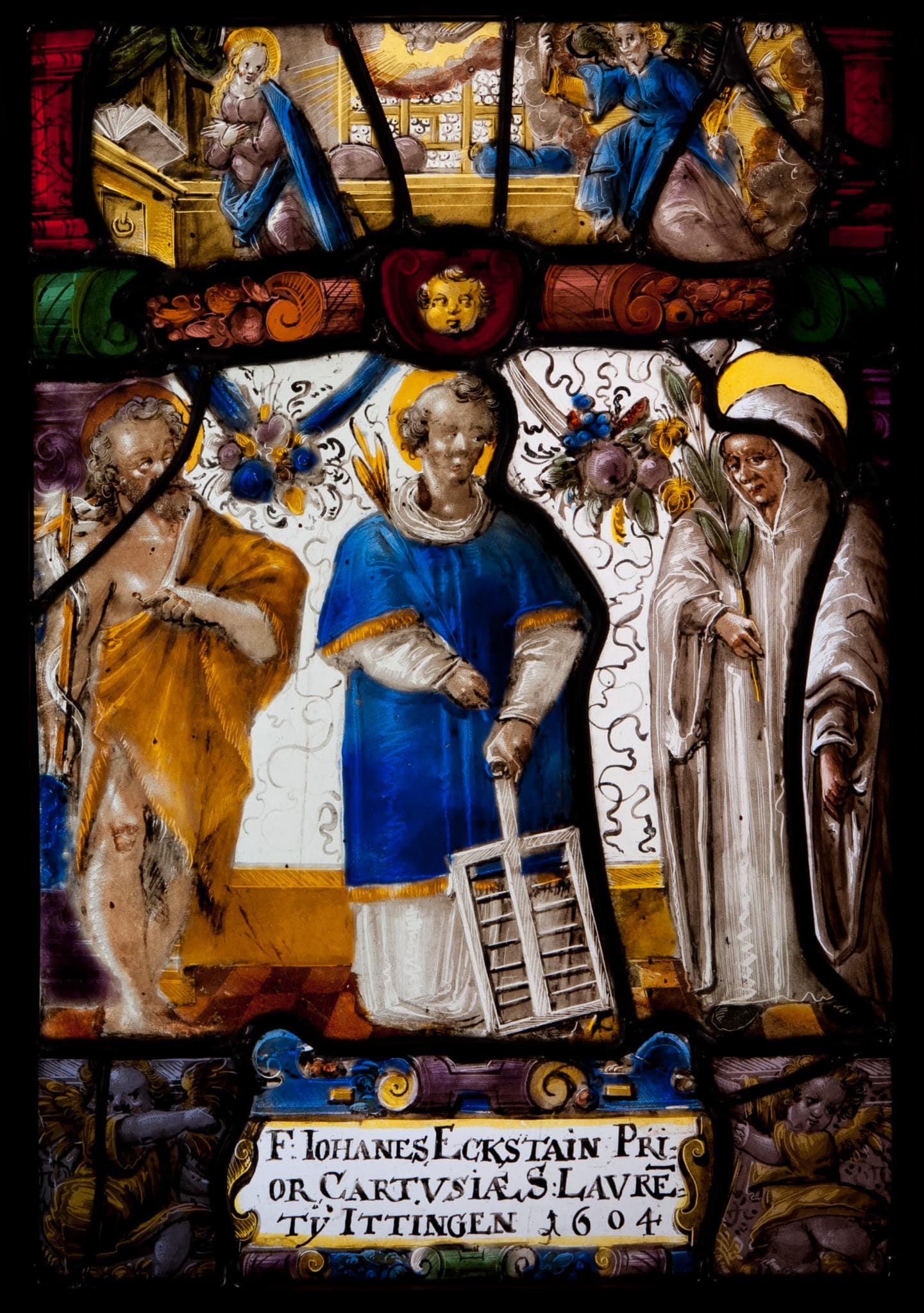 1607 schuf der Winterthurer Glasmaler Hans Jegli eine Scheibenriss-Serie (und wahrscheinlich die entsprechenden Glasgemälde) für die Gemeinden Uesslingen und Buch (Schweizerisches Nationalmuseum, Inv. Nr. 1922/1108 und 6/34), für den Uesslinger Pfarrer Michael Lichtenfels (Historisches Museum St. Gallen) sowie für den Ittinger Gerichtsschreiber Johann Wendel Locher (TG_1446, TG_1789). Uesslingen gehörte zur niederen Gerichtsherrschaft Ittingen und die dortigen Kartäuser hatten die Kollatur über die Uesslinger Kirche inne. Demnach war die Scheibenserie vermutlich für die Kartause Ittingen bestimmt (vgl. Boesch, 1955, 28–29). Jeglis Tätigkeit für Ittingen legt zusammen mit stilistischen Vergleichen nahe, dass er der Schöpfer des vorliegenden Glasgemäldes für den Ittinger Prior Johannes Eckstein war. Neben den genannten Rissen lässt sich insbesondere die Frauenfelder Stadtscheibe (TG_21) vergleichen. Auf dem Riss für Johann Wendel Locher (TG_1789) ist ausserdem die Szene der Verkündigung im Oberbild sehr ähnlich gestaltet wie auf derjenigen für den Prior.