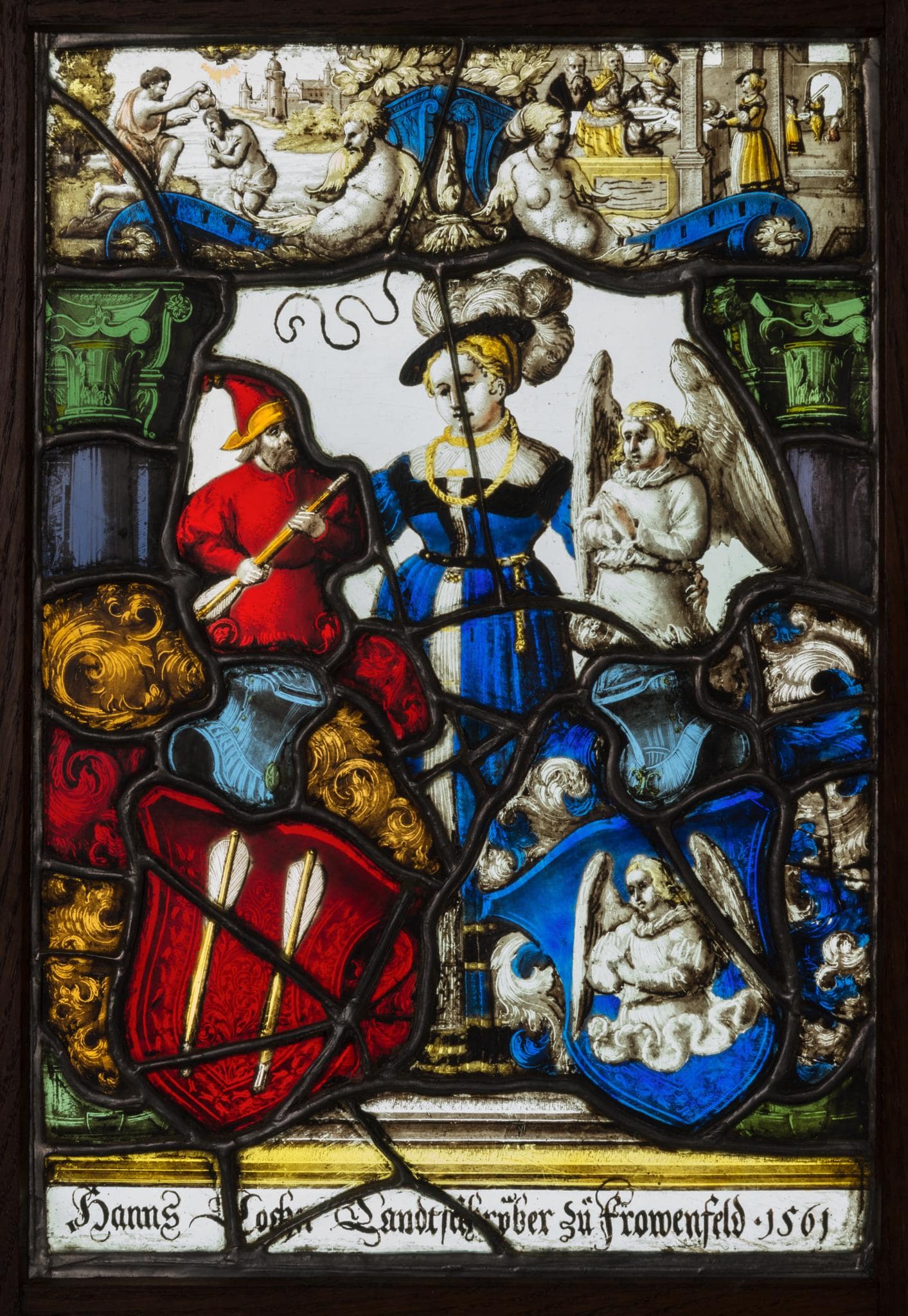 Die beiden vor farblosen Grund gesetzten, einander in heraldischer Höflichkeit zugewendeten Vollwappen des Stifterpaares werden von einer Dame gehalten, die zwischen ihnen auf dem mit dem Namen Hans Lochers beschrifteten Podium steht. Diese erscheint in vornehmer Bürgertracht, bestehend aus einem goldgesäumten, langen blauen Gewand, einem schwarzen Federbarett und einer Goldkette. Figur und Wappenschilde rahmen violette Doppelstützen mit grünen Kapitellen und ein blauer Rollwerkbogen, auf dem ein nacktes männliches und weibliches Mischwesen liegen. Das Oberbild schildert Begebenheiten aus dem Leben Johannes des Täufers, des Namenspatrons Hans Lochers. Links ist dieser bei der Taufe Christi zu sehen und rechts ist im Hintergrund einer Pfeilerhalle dessen Enthauptung dargestellt, während im Vordergrund Salome das Haupt von Johannes an die Tafel von Herodes trägt (Mk 6, 14–29).