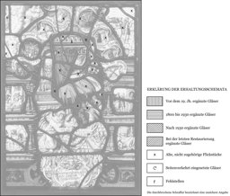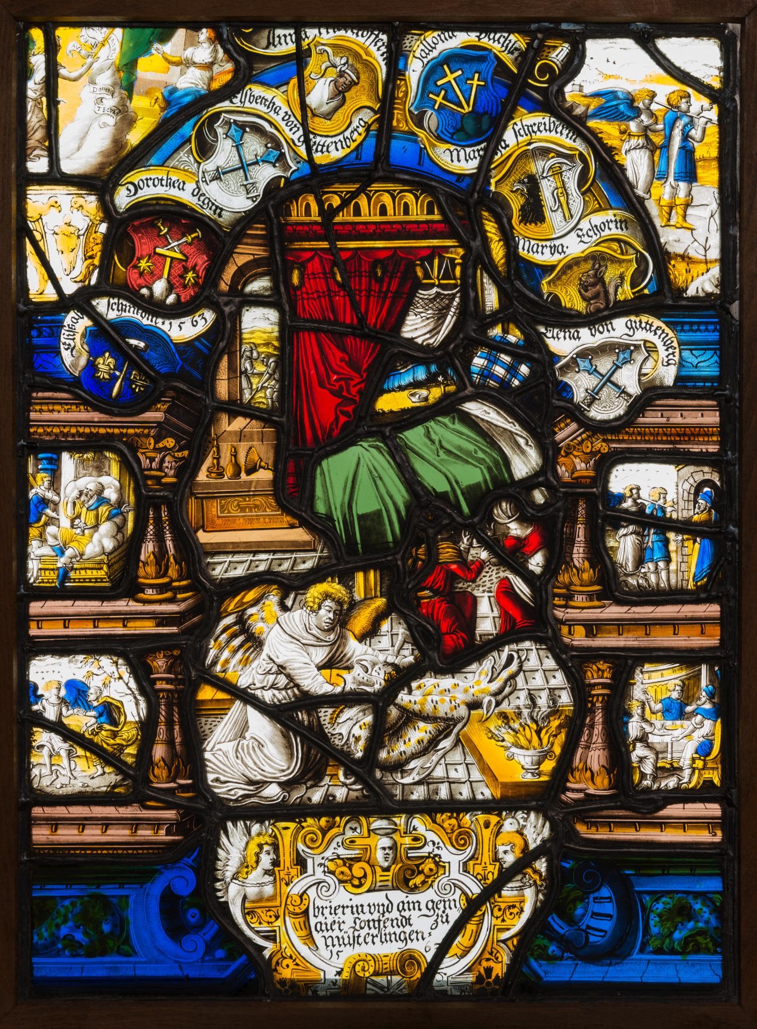 Die zusammengeflickte Scheibe enthält in ihren Rahmenkompartimenten verschiedene Szenen aus der Geschichte von Tobias (Tobit), wie sie im gleichnamigen apokryphen Buch geschildert wird. Fragmente zweier derartiger Szenen finden sich gleichfalls im Zentrum. Als Teil des originalen Mittelbildes anzusprechen sind vielleicht die Gläser, die den durch einen Engel zusammengeschnürten Dämon Asmodis zeigen, den Tobias zuvor durch Verbrennen von Fischherz und -leber gebannt hatte. Die Gläser darüber hingegen dürften aus einer anderen der Tobias-Geschichte gewidmeten Scheibe stammen. Darin wiedergegeben ist das Dankgebet von Tobias und Sara nach der Vertreibung des Dämons (Tob 8,1–8; vgl. TG_32; Hasler 1996/97, Bd. 2, Kat.-Nr. 585). Seitlich des zusammengestückten Mittelbildes sind je zwei Tobias-Szenen festgehalten. Links ist Tobias mit dem Engel auf seiner Wanderschaft (unten) sowie vermutlich bei seiner Rückkehr zum erblindeten Vater (oben) zu sehen. Rechts erscheint er mit dem Engel einmal an einem gedeckten Tisch (unten) und einmal im Gespräch mit einem Mann (oben). Im oberen Eckfeld rechts zu Seiten der bogenförmig aufgereihten, wohl zur Scheibe gehörenden, aber sicher nicht durchwegs original angeordneten Wappenschilde ist Tobias nochmals mit dem Engel in einer Landschaft wiedergegeben. Dabei hat man es wohl eher mit einem eingeflickten denn originalen Glasstück zu tun. Ganz bestimmt ein Flickstück bildet die Verkündigung an Maria auf der Gegenseite. Die Fusszone füllt die zwischen blaue Postamente gesetzte Rollwerkkartusche mit der Stifterinschrift.