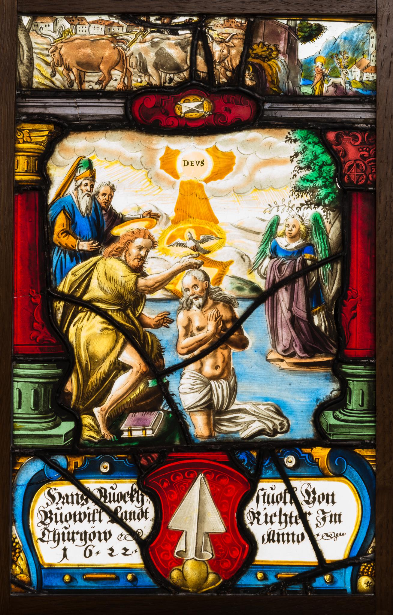 Im Hauptbild tauft Johannes Christus im Jordan. Der feierliche Akt wird von zwei Männern hinter Johannes dem Täufer sowie von dem am gegenüberliegenden Ufer mit dem Mantel Christi stehenden Engel verfolgt. Über den Figuren erscheint am Himmel die Gott symbolisierende Sonne, aus deren Strahlen die Taube des Heiligen Geistes auf Christi Haupt herniederschwebt. Die Rahmung bilden zwei rote, ein violettes Gebälk tragende Säulen. Am Fuss der Scheibe sind das Wappen Hans Ruckstuhls und die Stifterinschrift in einer blauen Rollwerkkartusche festgehalten. Im Oberbild links ist eine Ochsenherde zu sehen. Das Stück rechts mit einer Darstellung des Kirchgangs der hl. Idda ist ein altes Flickstück.