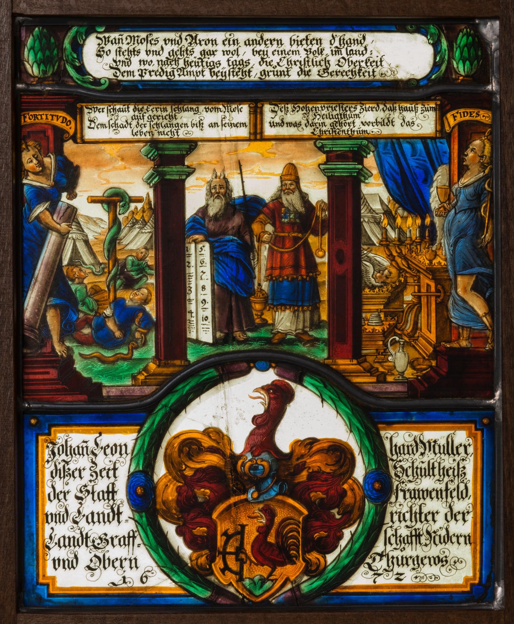 Im durch Pfeiler dreigeteilten Mittelbild sind die Gebrüder Moses und Aaron stehend nebeneinander festgehalten, wobei der erstere die Gesetzestafeln und der letztere ein Weihrauchfass hält. Im Bildfeld neben Moses erscheinen die Eherne Schlange (4. Buch Mose 21, 6–9) und in demjenigen neben Aaron das heilige Zelt mit Bundeslade und Leuchter, das Moses auf Geheiss Gottes errichten liess (2. Buch Mose 25 u. 35–38). Zur Erläuterung der Darstellung dienen die drei darüber angebrachten Legenden. Vor den Rahmenpfeilern befinden sich als weitere Figuren die Allegorien der Fortitudo (links mit Säulenstumpf) und der Fides (rechts mit Hostienkelch und schlangenumwundenen Kreuz). Am Fuss der Scheibe ist das lorbeerumkränzte Vollwappen Johann Leonhard Müllers der Tafel mit der Stifterinschrift zentral aufgesetzt.