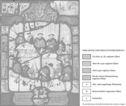 Das Hauptbild stellt die in in einer Stube mit Butzenfenstern zur Sitzung versammelten Gerichtsherren von Hessenreuti dar. In der Mitte der Gerichtsrunde ist vermutlich der Ammann mit dem Gerichtsstab festgehalten. Zu seiner Rechten sitzt der Protokollführer an einem Tisch. Das Figurenbild wird von zwei seitlichen blauen Hermenpilastern eingefasst. Darüber spannt sich ein roter Volutenbogen mit einer grossen blauen Scheitelkartusche, in der sich zwei Putten an Voluten festkrallen. Das rechte Oberbild zeigt die drei Jünglinge im Feuerofen, die Nebukadeznar verbrennen lassen wollte, die durch Gott aber errettet wurden (Dan 3, 19–30). Im linken Oberbild sollen laut der Publikation von 2015 bewaffnete Gerichtsweibel bei der Verhaftung eines Verdächtigen zu sehen sein. Die betreffende Darstellung mit einer Gruppe von Männern und Frauen ist allerdings aus alten Flickstücken zusammengesetzt und inhaltlich nicht klar erschliessbar (an ihrer Statt dürfte ursprünglich eine weitere Bibelszene vorhanden gewesen sein). Unten in der Mitte befindet sich das Wappen des Niklaus von Gall und beidseitig davon die Stifterinschrift.