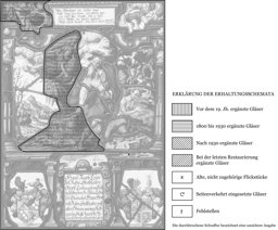 Wappen Rahn, Hans Heinrich und Escher vom Glas, Ursula: Geviert, 1 und 4 geteilt von Violett (eigentlich Rot) mit wachsendem, in ein von Rot und von Gold mit zwei schwarzen Balken gespaltenes Hemd und eine golden-schwarze Kopfbinde gekleideten Mannsrumpf und von Gold und Schwarz geschacht (Rahn), 2 und 3 in Blau mit goldenem Schildrand ein silbernes Buckelglas, überhöht von goldenem Stern (Escher); Helme: blau mit goldenen Spangen; Helmdecke: rechts rot sowie golden und schwarz (Rahn), links blau und silbern (Escher);