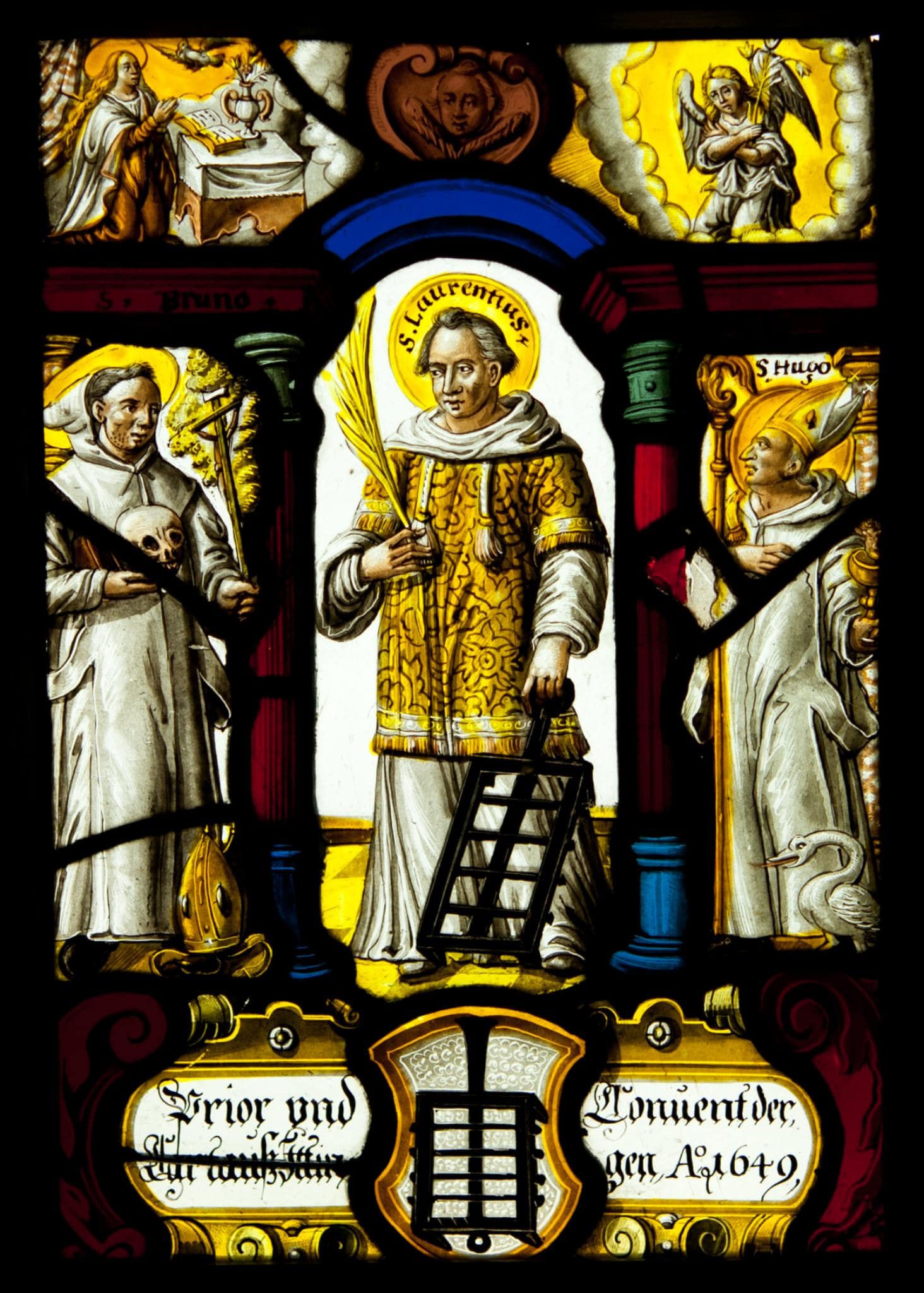 11H(LAURENCE) · Laurent de Rome, martyr et diacre; attributs possibles : livre, encensoir, croix, dalmatique, gril, palme de martyr, bourse (ou coupe pleine de pièces d'or)