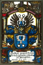 Die seitlich von schmalen Stützen und oben von einem roten Gebälk gerahmten Vollwappen der drei Stifter sind vor farblosem Grund in der Scheibenmittelzone nebeneinander aufgereiht. Darunter befinden sich in Blattkartuschen die Stifternamen. Das Oberbild zeigt im linken Feld den am Boden schlafenden Jakob bei seinem Traum von der Himmelsleiter (1. Buch Mose 28, 11–15) und im rechten seinen Kampf mit dem Engel (1. Buch Mose 32, 23–29).