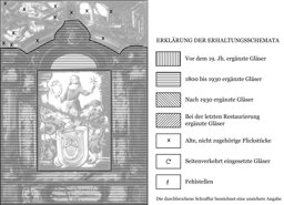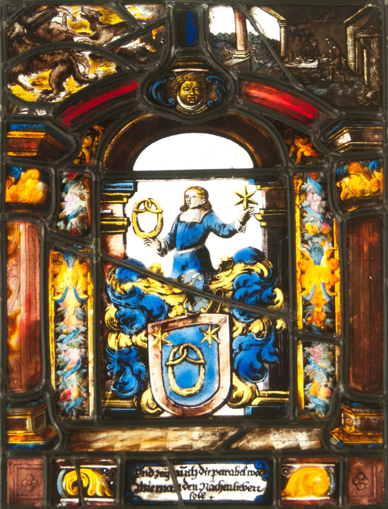 Das vor farblosen Grund gesetzte Vollwappen Keller umfasst eine mit Blattranken dekorierte, auf einem niedrigen gefliesten Podium stehende Bogenrahmung. Ihr vorgelegt sind zwei rostbraune, einen roten Flachbogen tragende Aussenpfeiler. Die Inschrift in der ergänzten Tafel an der Stirnfront des Podiums bezieht sich auf die Bibelstelle Lukas 10, 25–37 (“Liebe deinen Nächsten wie dich selbst”). Im Gegensatz zur analog komponierten Scheibe mit der Darstellung Samsons im Oberbild lassen sich hier die beiden Szenen im Oberlicht damit jedoch nicht in Verbindung bringen. Davon zeigt diejenige rechts Jakob, der auf Bitte Esaus diesem für dessen Erstgeburtsrecht von seinem Linsengericht zu essen gibt (1. Mose 25, 27–34). Die betreffende Szene, die in identischer Form ebenfalls im rechten Obereck der Wappenscheibe Gideon Scherbs (TG_1450) erscheint, beruht auf dem Kupferstich der Bilderbibel Matthäus Merians des Älteren. Was genau im linken Obereck festgehalten ist, lässt sich aufgrund der Sprungbleie nicht mehr erkennen (attackierender Hund?).