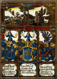 Das Vollwappen Gideon Scherbs steht vor farblosem Grund auf dem Podium, an dem sich dessen Name in einer Rollwerkkartusche befindet. Die sich auf dem Podium erhebende Rahmenarchitektur besteht aus zwei Pfeilern und einem violetten Flachbogen, dessen Scheitelkartusche ein geflügelter Engelskopf schmückt. Im Oberbild ist eine Flusslandschaft zu sehen, an die sich zu beiden Seiten ein Innenraum anschliesst. Im demjenigen rechts ist Jakob zu sehen, der auf Bitte Esaus diesem für dessen Erstgeburtsrecht von seinem Linsengericht zu essen gibt (1. Mose 25, 27–34). Diese Szene erscheint in identischer Form ebenfalls im rechten Obereck der Wappenscheibe Keller(?) (TG_1438). Im gegenüberliegenden Feld ist wie auf der anderen Wappenscheibe Scherb (TG_487) festgehalten, wie Isaak Jakob segnet (1. Mose 27, 1–29). Die beiden genannten Oberbildszenen beruhen auf den entsprechenden Kupferstichen der Bilderbibel Matthäus Merians des Älteren.