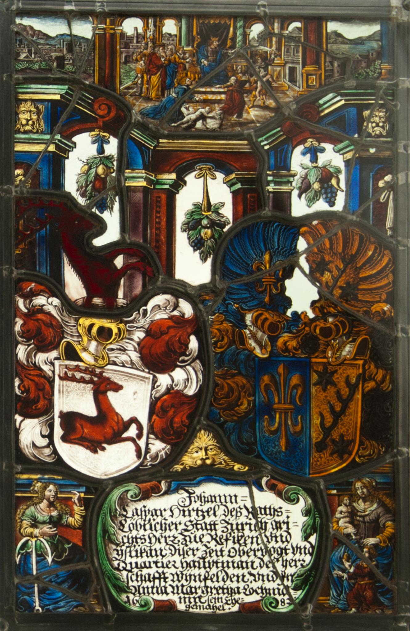 Die Vollwappen Hans Kaspar Hirzels und Anna Margaretha Lochmanns stehen vor einem perspektivisch stark verkürzten dreiachsigen Rahmengehäuse, von dessen drei Bögen je ein Fruchtbouquet herabhängt. Das Oberbild schildert das sich in einer prachtvollen Arkadenhalle vollziehende salomonische Urteil. Im Zentrum dieser Halle sitzt der weise König Salomon auf seinem Löwenthron und spricht in Anwesenheit der beiden mit dem toten Kind vor ihm verweilenden Frauen das Urteil. Dabei weist er mit seiner linken Hand auf den Krieger zu seiner Linken, der sich daran macht, mit seinem Schwert das lebende Kind zu teilen (3 Kg 3, 16ff.). Diese Szene gestaltete der Glasmaler nach dem Kupferstich in Matthäus Merians des Älteren Bilderbibel. Die hohe Fusszone füllt die mit der langen Stifterinschrift besetzte Rollwerkkartusche, zu deren Seiten sich je eine Tugendgestalt in langem blauem Rock niedergelassen hat. Es handelt sich um die ihren rechten Arm auf den Anker stützende Hoffnung (Spes) sowie um die sich um ihre Kinder sorgende Caritas (Barmherzigkeit, Liebe; diese Figur von Brüllmann irrtümlicherweise als hl. Anna selbdritt gedeutet).
