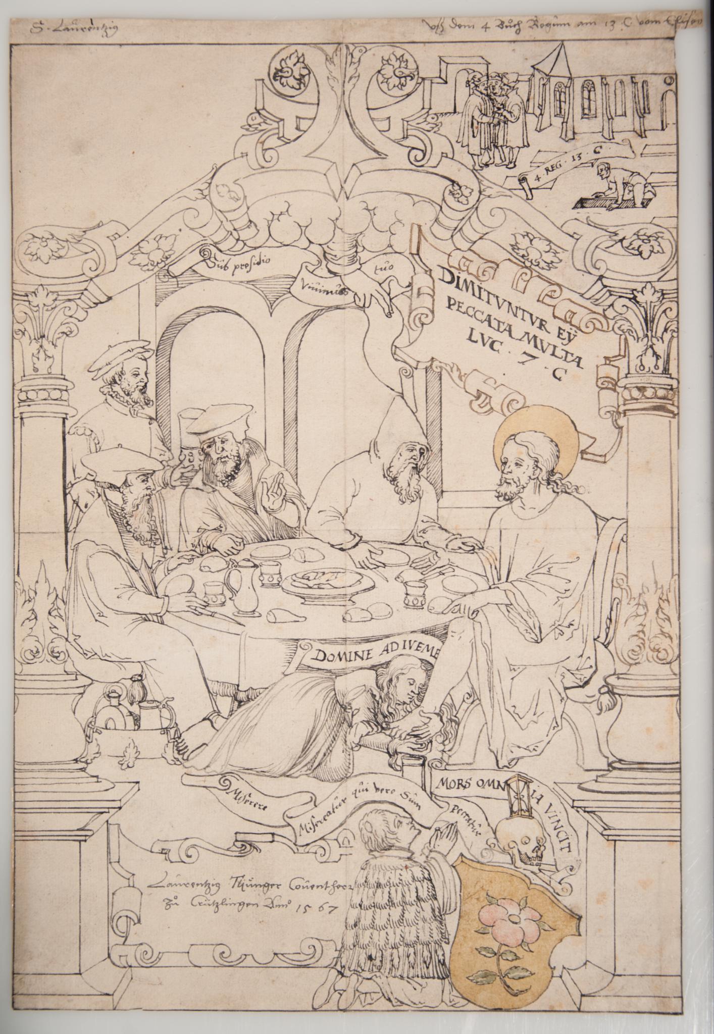 Das Hauptbild zeigt die im Hause des Pharisäers Simon zum Mahle versammelte Männerrunde mit Christus und der Sünderin, die vor dem an der rechten Seite des reich gedeckten Rundtisches sitzenden Herrn am Boden kniet und ihm die Füsse salbt (Lk 7, 36–50). Die Szene umfassen zwei einen Rollwerkbogen tragende Säulen. Aus den Wolken unter diesem Bogen ragt neben der Rollwerktafel mit dem Bibelverweis die Jesus und die Sünderin segnende Hand Gottes hervor. Während das Oberbild im Zwickelfeld oben links unausgeführt blieb, erscheinen im demjenigen rechts eine sich über ein Loch am Bogen neigende Figur und hinter ihr drei neben einem gotischen Kirchenbau diskutierende Männer. Laut den Angaben auf der beigefügten Schriftrolle und am oberen Rand bezieht sich die Darstellung auf das 13. Kapitel im 4. Buch der Könige. Demnach ist hier dargestellt, wie der in das Grab Elisas geworfene tote Mann durch die Berührung mit diesem wieder lebendig wird und sich auf seine Füsse stellt (4 Kg 13, 20–21). Gemäss der Inschrift über dem leer gebliebenen Oberbildfeld sollte darin der hl. Laurentius, der Namenspatron des Stifters, festgehalten werden. Am Scheibenfuss ist zwischen den Säulenpostamenten Thungers Name in einer Rollwerktafel festgehalten. Davor kniet dieser vor seinem Wappen mit Totenkopf und Sanduhr als Helmzierden und schaut mit gefalteten Händen andächtig zur Figur Christi empor.