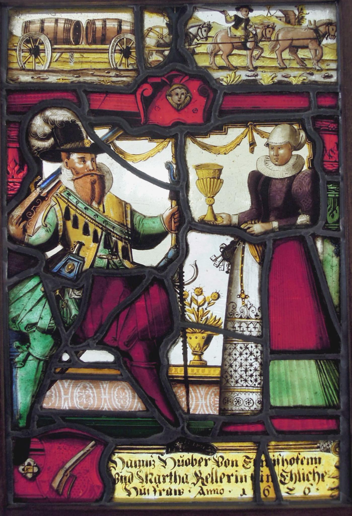 Das Stifterpaar steht in festtäglicher Tracht vor farblosem Grund auf dem Podium, dessen Front das Wappen Hans Hubers und die Namen der beiden Eheleute zieren. Während der Mann mit geschulterter Büchse, der Gewehrgabel in seiner Linken und mit über die Schulter gelegtem Patronenbandelier erscheint, reicht ihm die Frau den Willkommtrunk in einem Pokal. Zwei Säulen tragen das rote Gebälk mit Scheitelkartusche. Darüber ist eine Weinfuhre dargestellt.