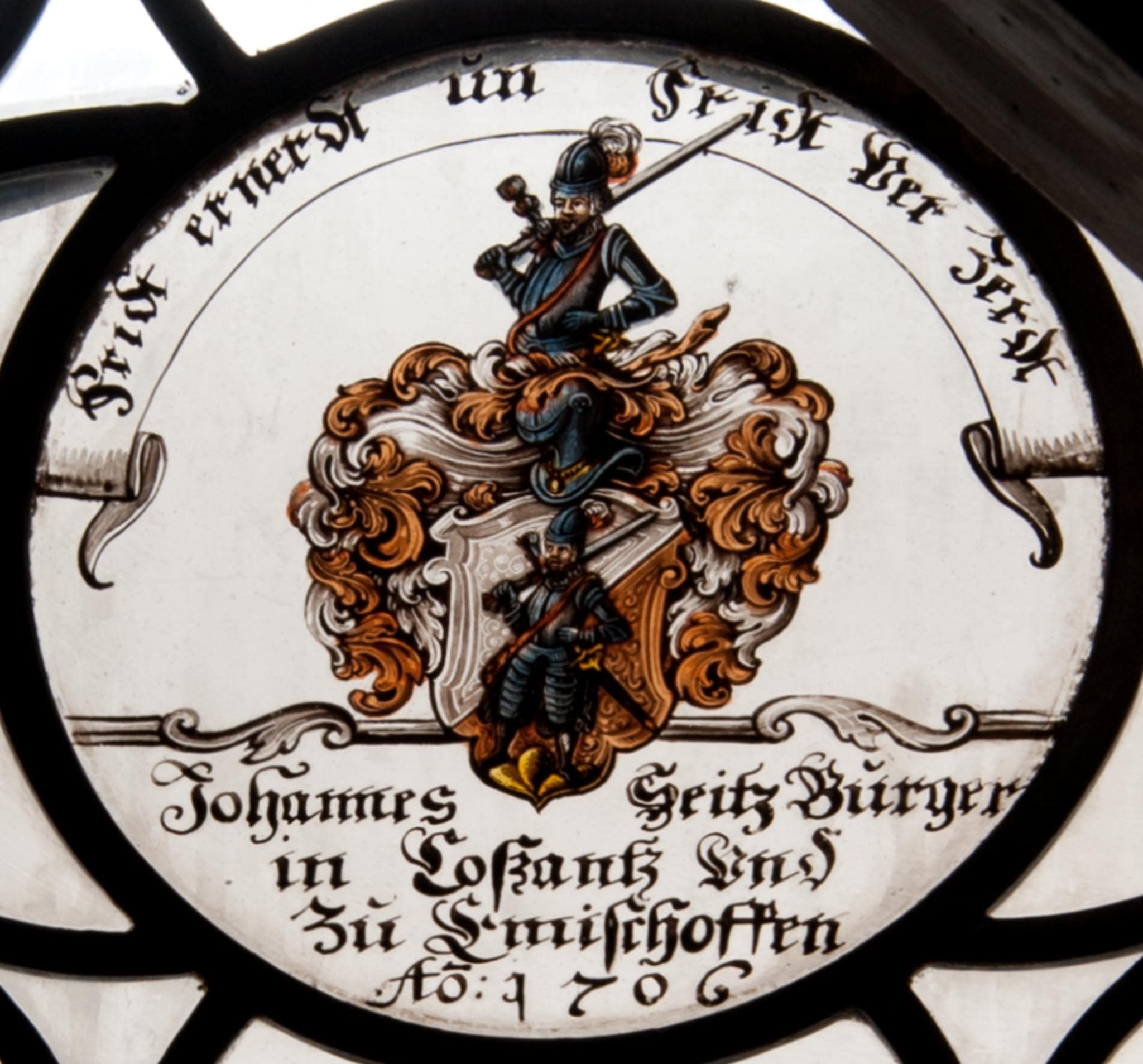Das Rosgartenmuseum in Konstanz besitzt zahlreiche ähnliche sechseckige Scheibchen aus der ersten Hälfte des 18. Jahrhunderts. Das vorliegende Scheibchen stammt sicherlich vom damals einzigen Konstanzer Glasmaler Johann Georg Spengler.