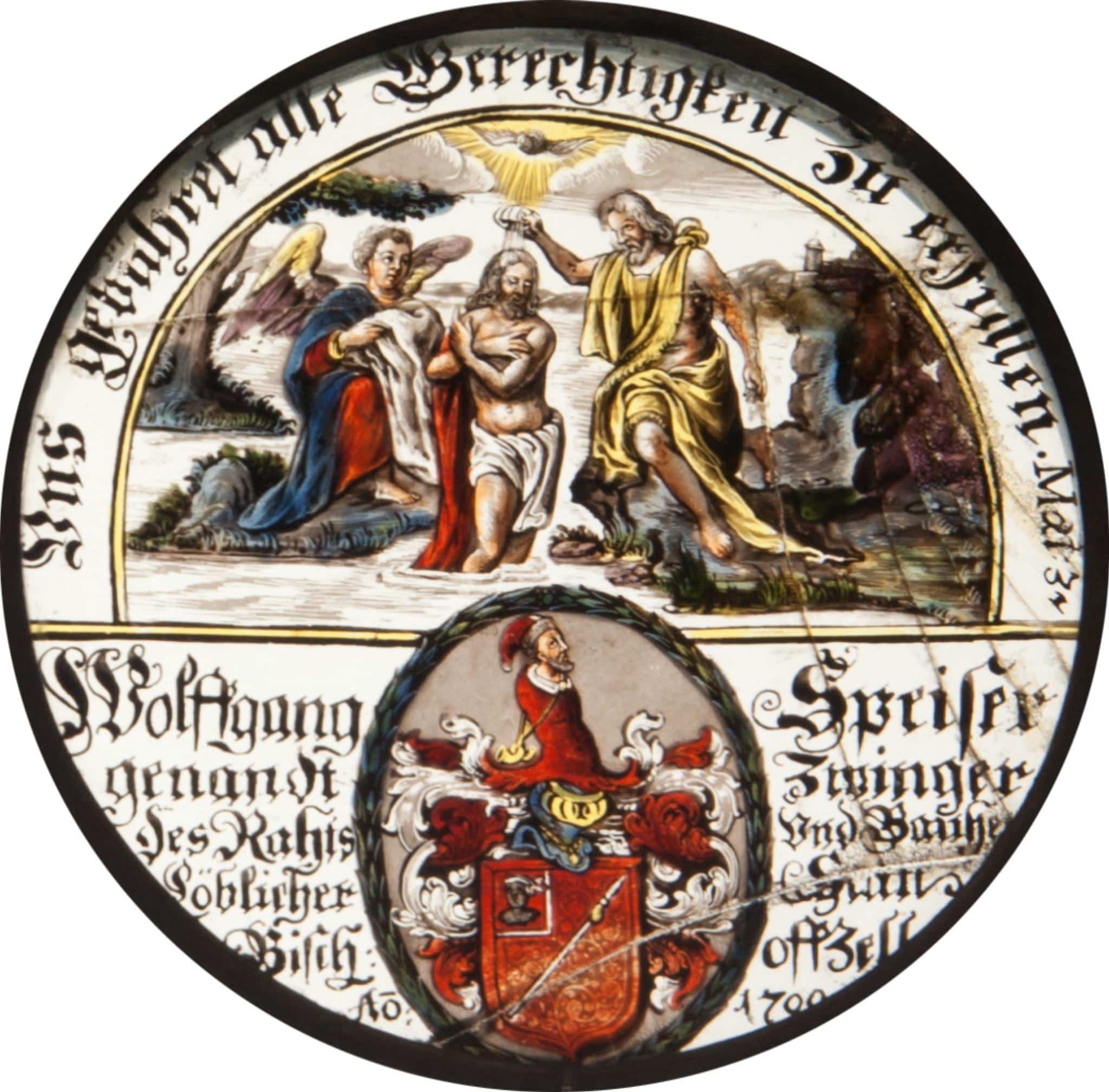 Wolfgang Zwinger (3.11.1647–18.6.1708) von Bischofszell, der Sohn Wolffriedrichs und der Katharina Keller, war Goldschmied von Beruf und amtete in seiner Heimatstadt als Rat, Oberbauherr und Siechenpfleger. Am 29. April 1672 heiratete er in Bischofszell die von dort stammende Sabina Gonzenbach (11.9.1639–7.7.1726), die Tochter Hans Georgs und der Ursula Held. Sie schenkte ihm zwischen 1673 und 1681 zwei Töchter und den Sohn Hans Georg, von dem im Museum Bischofszell ebenfalls eine Rundscheibe existiert (TG_252) (Bischofszeller Geschlechter).