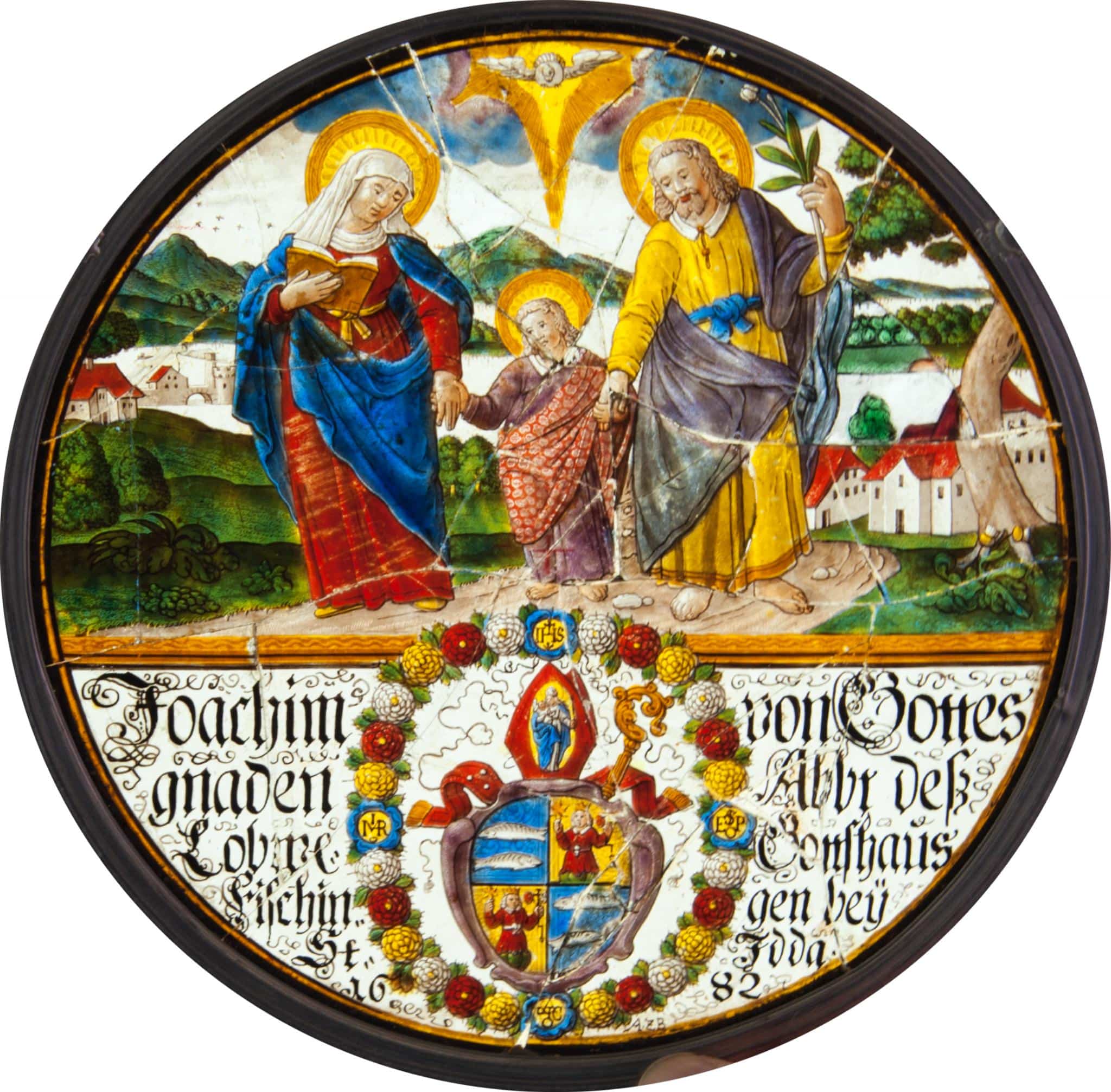 Runde Figurenscheibe Joachim Seiler, Abt Kloster Fischingen, mit der Heiligen Familie