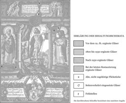 Farbloses und farbiges Glas; Bemalung mit Schwarzlot, Silbergelb, Eisenrot und blauer Schmelzfarbe; auf einigen Farbgläsern rückseitig die Brandmarke „2“.