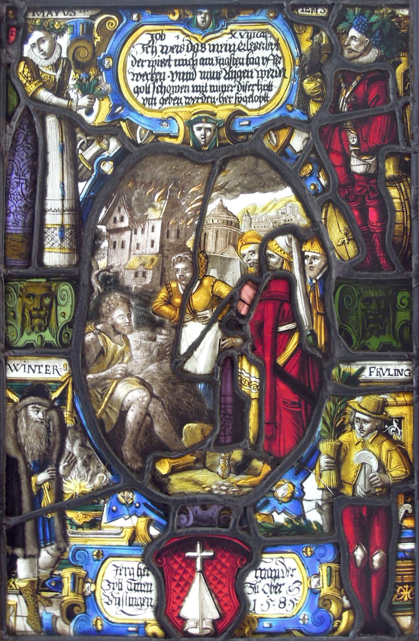 Im ovalen Mittelbild ist der aussätzige Hiob umgeben von seiner Ehefrau und seinen Freunden vor seinem niederbrennenden Haus dargestellt. Die Szene wird von den Allegorien der vier Jahreszeiten begleitet. Die bekränzte, einen Blumenstrauss in der Hand haltende Frauengestalt oben links gibt sich anhand ihrer Attribute als Frühling zu erkennen. Der Glasmaler bezeichnete sie seltsamerweise aber mit dem Monatsnamen “Mai” und dafür die männliche Figur unten rechts mit Sichel und abgeschnittenem Zweig als “Frühling”. Vermutlich handelt es sich dabei um einen Irrtum. Weil der Herbst im Mann oben rechts mit dem Weinfass, dem Falken in der Hand und dem Traubenkranz um die Stirn verkörpert ist sowie der Winter im Bärtigen unten links, der sich am Feuer wärmt, lässt sich der Mann unten rechts mit Sichel und Zweig nämlich nur mit dem Sommer gleichsetzen. Am unteren Bildrand sind Stifterinschrift und Wappen sowie am oberen zwischen Frühling und Herbst die Bildlegende angebracht.