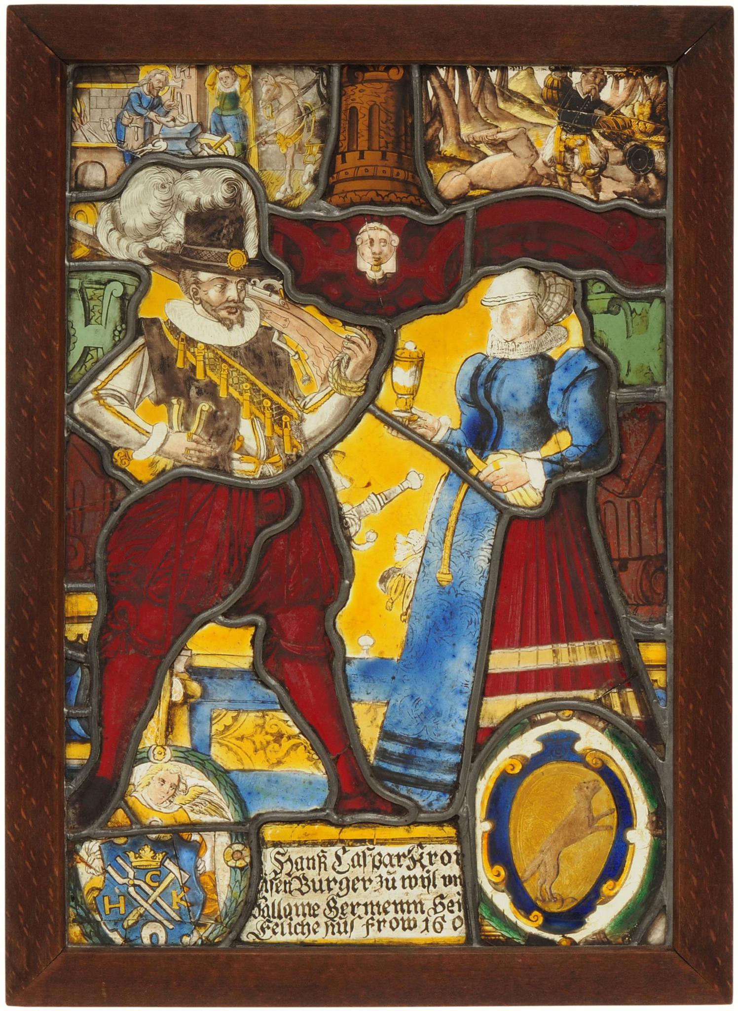 Das Stifterehepaar im Zentrum der Scheibe erscheint vor gelbem Grund und einer blauen Brüstung. Der Mann mit der Büchse auf seiner Schulter trägt rote Beinkleider, ein braunes Wams, ein Hemd mit Mühlsteinkragen, ein Federbarett und um die Brust das Patronenbandelier. Seine Frau in rotem, weiss gestreiftem Rock, blauer Schürze und blauem Mieder sowie weisser Haube auf dem Kopf reicht ihm in ihrer Rechten den Pokal mit dem Willkommtrunk. Zu Füssen beider Figuren befindet sich die von den lorbeerumkränzten Wappen flankierte Inschriftentafel. Die seitlichen Rahmensäulen tragen ein rotes Rollwerkgebälk mit einer mittig eingesetzten Maske. Darüber ist im unterteilten Oberbild links das Wunder des hl. Eligius, der einem störrischen Pferd das Bein abschneidet, um es auf seinem Amboss zu beschlagen und dann wieder anzusetzen.
