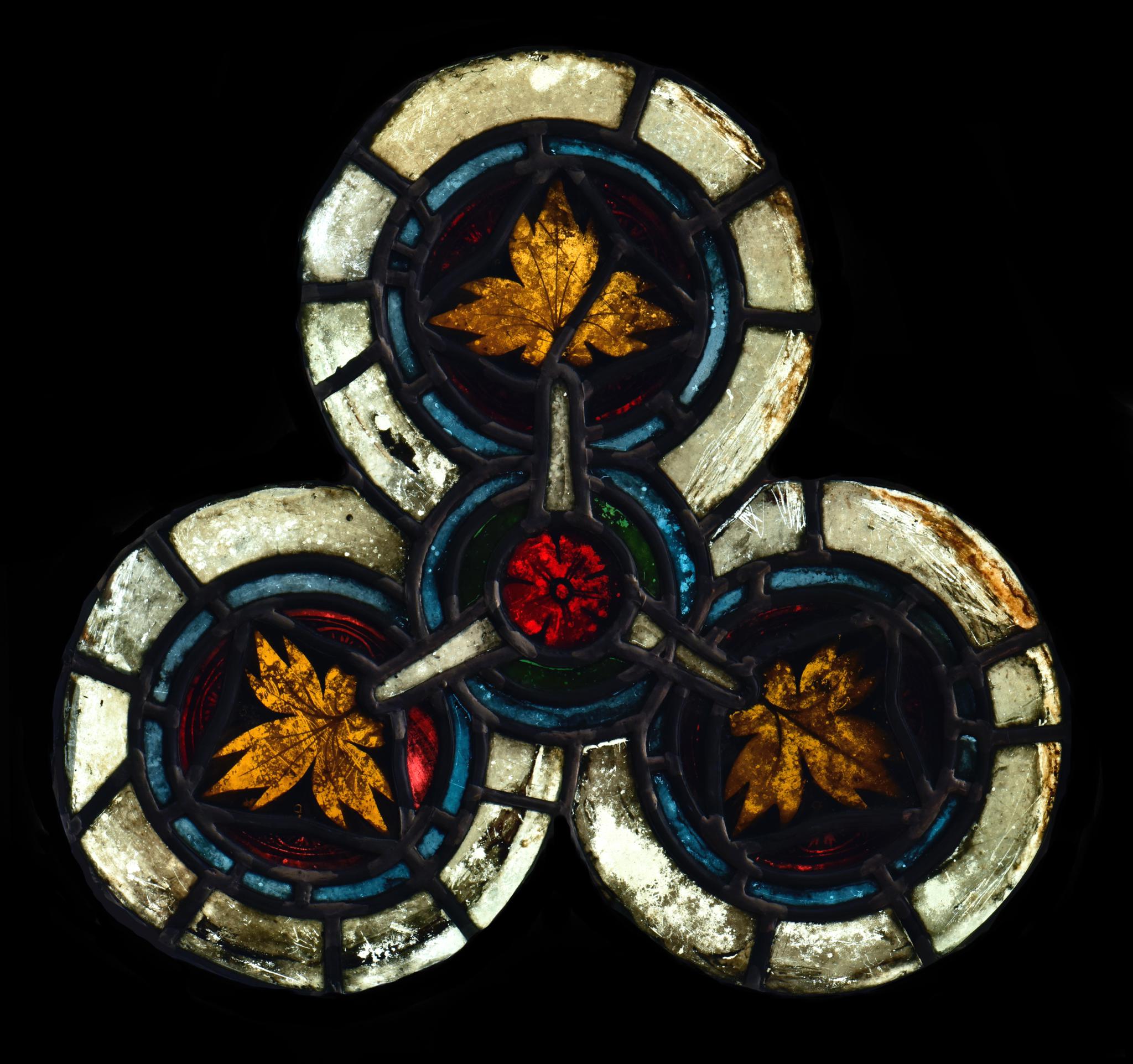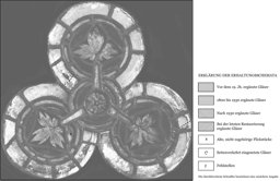 Die hellblauen, gelben und stellenweise auch die weissen Gläser sind aussenseitig von einem feinen punktförmigen Lochfrass überzogen. Das rote und grüne Glas zeigt sich hingegen weniger korrosionsanfällig. Die Leuchtkraft der Gläser ist ausserdem durch innenseitige Schmutzablagerungen (Russ?) gemindert. Das Blatt rechts unten fällt durch seine einfachere, mit kräftigeren Nervaturen gezeichnete Malweise heraus, dürfte jedoch zum originalen Bestand gehören. Ergänzt wurde lediglich ein rotes Glasstück im linken Passlappen. Zwei Sprünge in den Randgläsern. Kratzspuren. Neu verbleit.