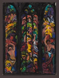 À la demande du père Maurice Moullet, Alexandre Cingria réalisa plusieurs projets pour les trois fenêtres du chœur de l’église du Couvent des Cordeliers : Le premier projet représente – de gauche à droite – la Résurrection, la Pentecôte et l’Ascension.