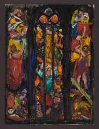 Étude préparatoire colorée d’un vitrail réalisé par Alexandre Cingria pour le choeur de l’église du Couvent des Cordeliers à Fribourg. Le thème représente la Pentecôte. La Vierge, au centre, est agenouillée les bras croisés. Elle est entourée de deux apôtres debout ayant les bras levés. Les têtes sont surplombées de flammes occupant toute la hauteur du dessin. Les occuli représentent la Trinité : Dieu le Père (à gauche), le Fils (à droite) et le Saint-Esprit (en haut). Les teintes sur fond noir sont dans les nuances jaune (flammes), bleu et rouge (personnages).
