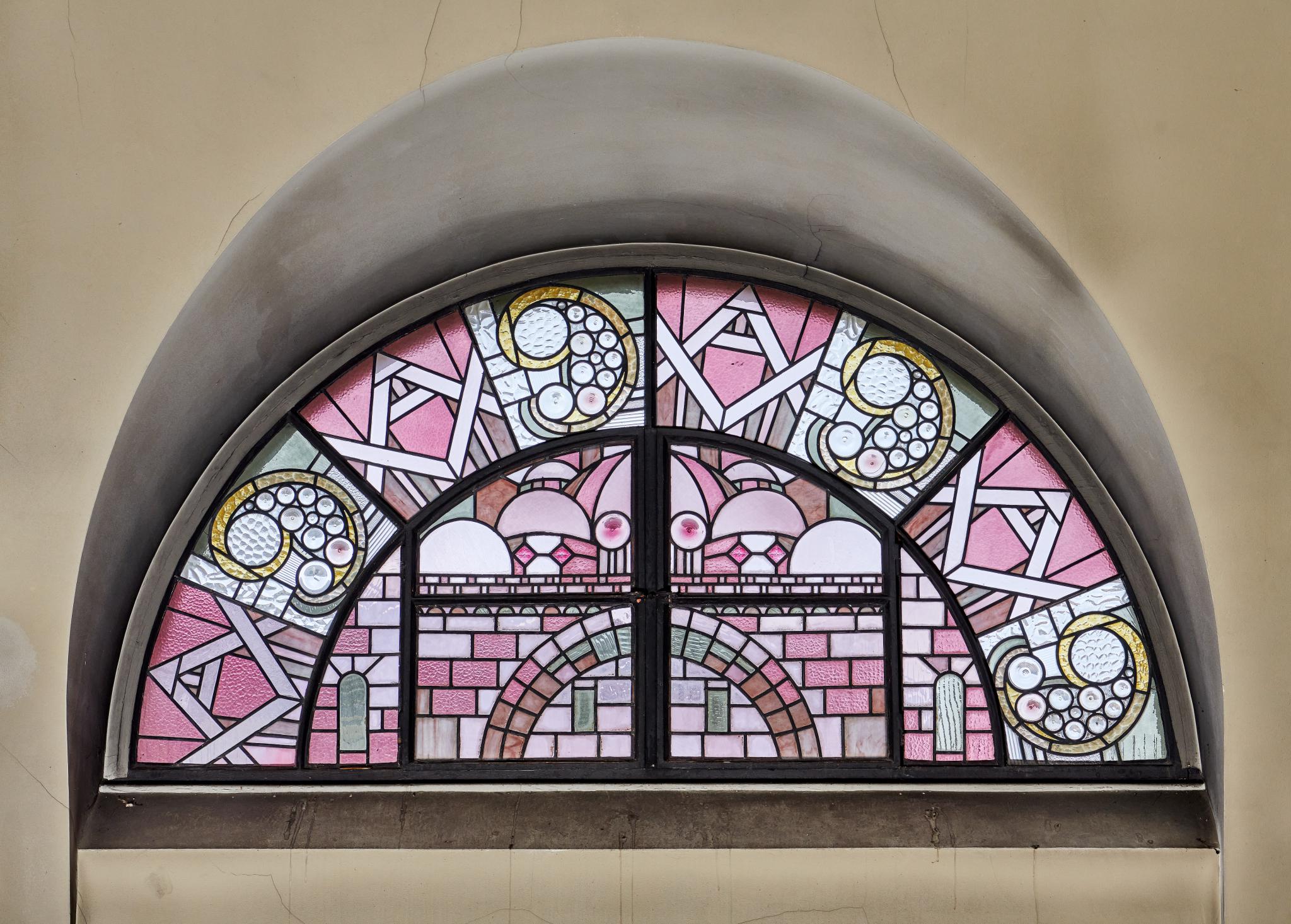 Bien que simples au premier abord, ces sept lunettes de la nef aux motifs presque identiques sont donc d’une grande complexité. Au niveau technique, ces verrières présentent une très grande variété de verres, de différentes structures et degrés de translucidité, filtrant la lumière et transformant sans doute considérablement l’atmosphère lumineuse de la nef par rapport à la première église néo-classique du XIXème siècle d’Henri Perregaux. Cette richesse des matériaux est un aspect typique des réalisations de Cingria. Sa collaboration avec l’atelier Chiara, qui possède un grand stock de verres du début du siècle utilisés jusqu’alors plutôt dans le cadre civil (pour des cages d’escalier, appartements, salles de bain), lui permet de libérer son potentiel créatif en mettant les matériaux au service de son expression artistique.