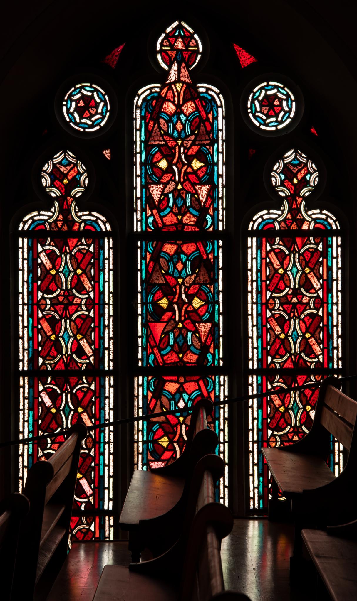 Monumentales, dreilanzettiges Masswerkfenster mit kleinteiligen, geometrischen Ornamenten in Rot- und Grüntönen.
