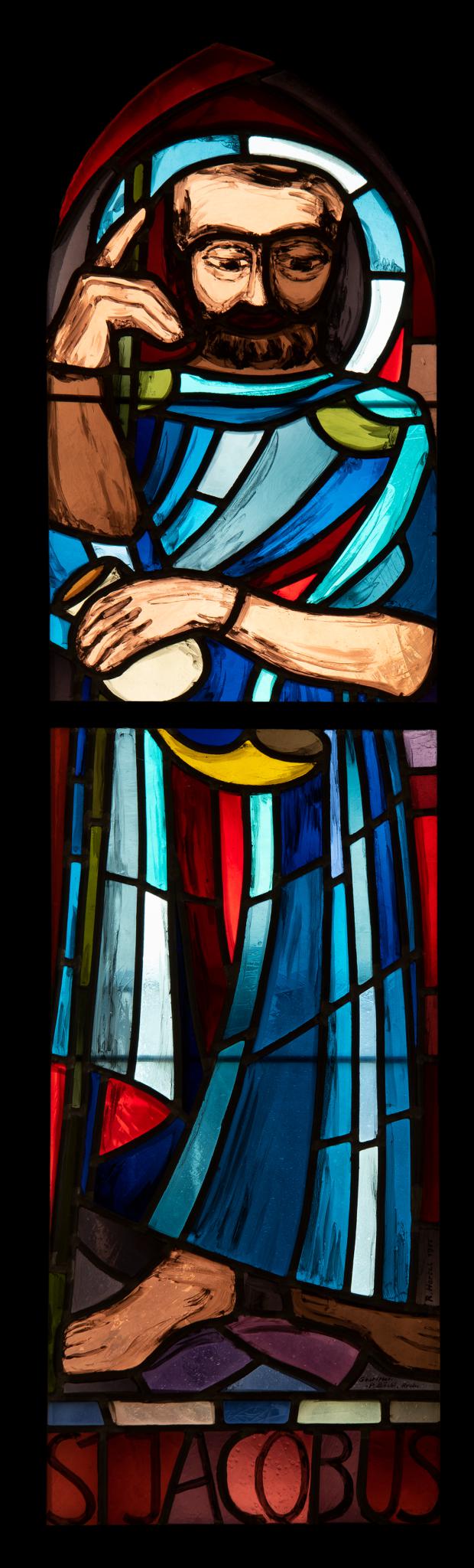 Spitzbogiges Fenster in rundbogiger Laibung. Der Pilgerheilige Jakobus hält den Pilgerstab und ein Trinkgefäss. An seiner Hüfte trägt er ein Horn.