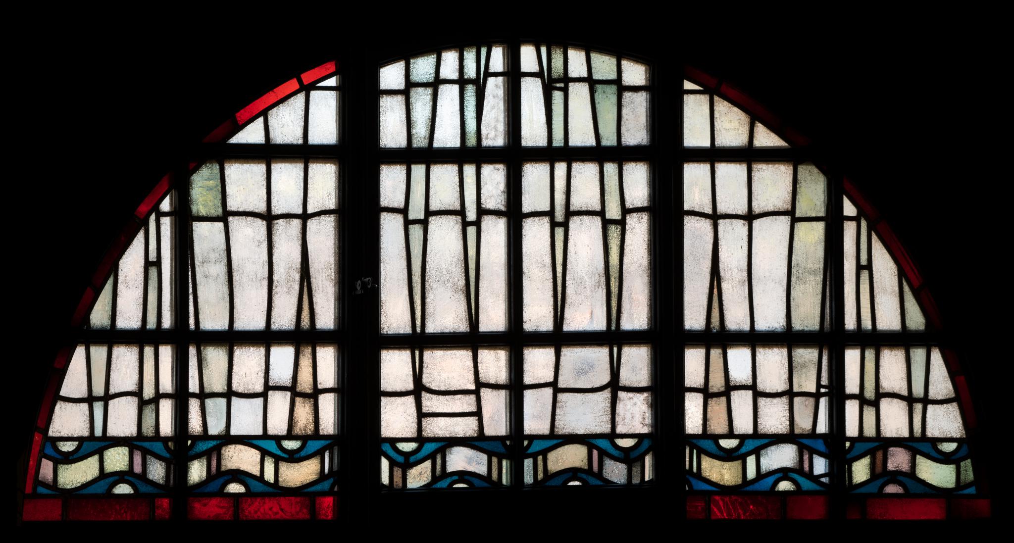 Halbkreisförmiges Bogenfenster mit graugetönter Fensterfläche, deren Bleiruten vertikal und horizontal bewegt angeordnet sind, einen Vorhang imitierend. An der Basis blau-weisses Wellenband, um das Fenster herum verläuft ein schmaler roter Rahmen. (Identisch mit N II und N IV).