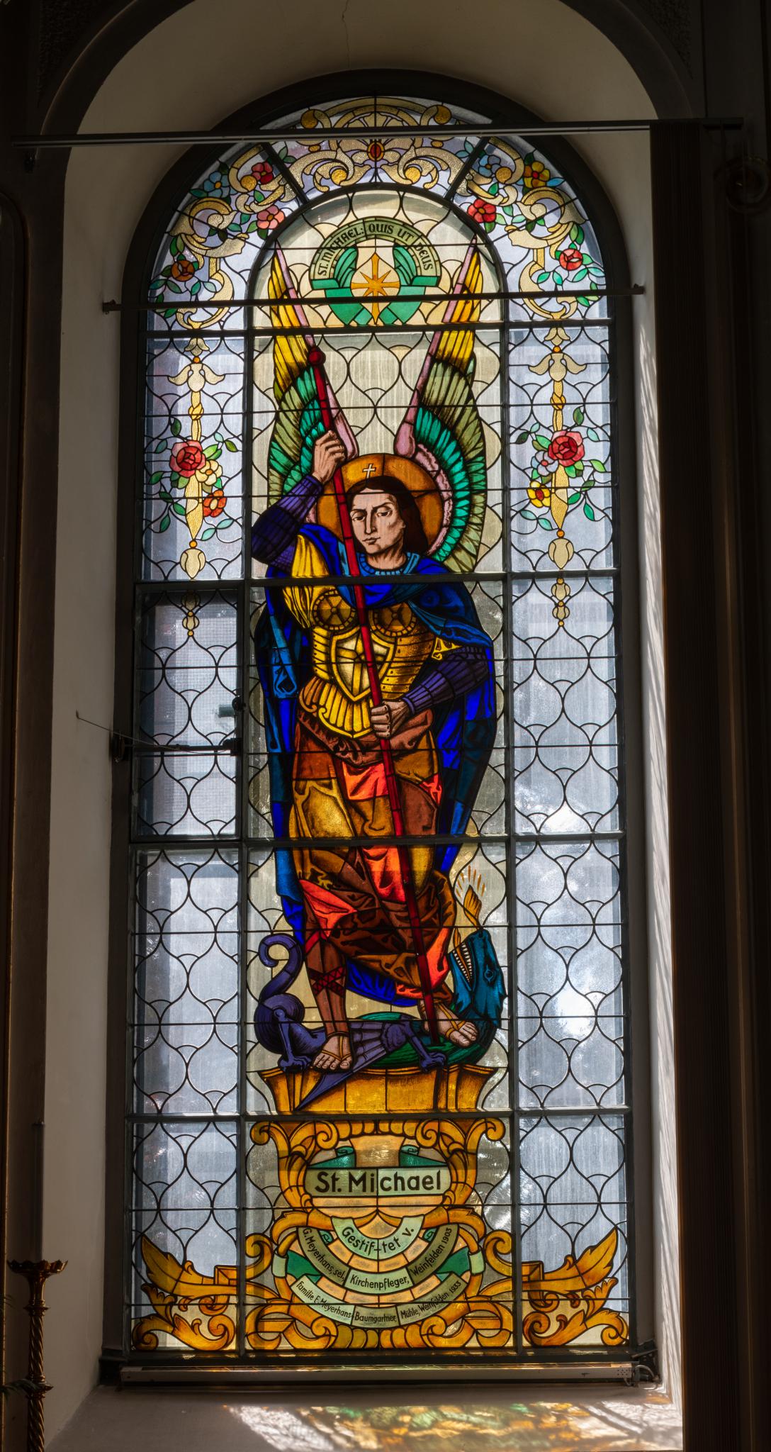 Jakob Georg Röttingers vorgeschlagene “Muster” gefielen am Besten. Die Verwendung von Opalgläsern erzielte bei seiner Offerte eine Preisreduktion (was bei anderen einen Aufschlag bedeutete). Daher erhielt der Glasmaler den Zuschlag und führte die zwölf Rundbogenfenster sowie sieben Okuli mit Blumengirlanden und einer Kartusche am Scheibenfuss aus.