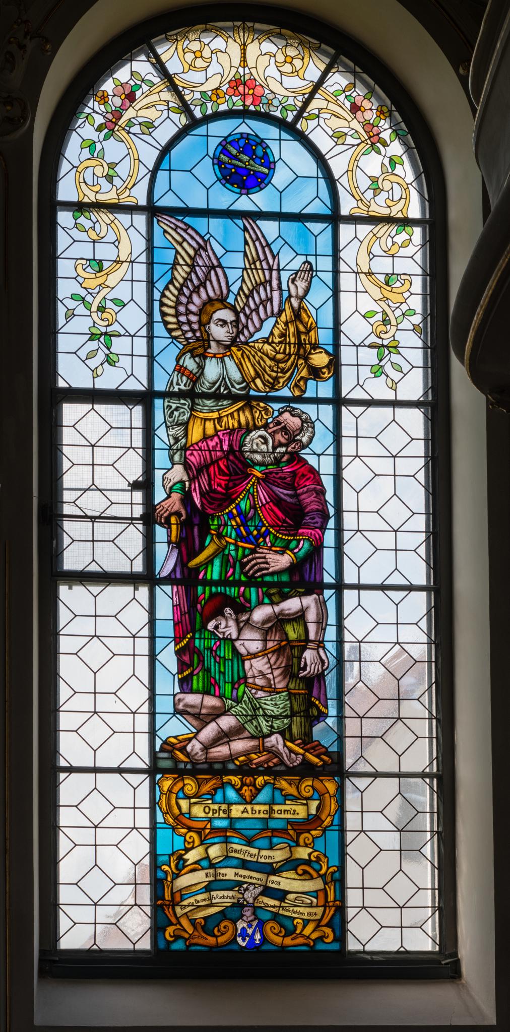 Das St. Galler Kloster Magdenau, welches 1903 das Fenster stiftete, hatte wiederholt Glasgemälde in den Thurgau geschenkt. Zweimal, 1559 und 1618, wurde das Schwesterkloster Tänikon bedacht, sowie 1563 wahrscheinlich auch das Kloster Feldbach bei Steckborn. Die heute im Historischen Museum Thurgau bewahrte Wappenscheibe der Magdenauer Äbtissin Dorothea Geilinger war vermutlich für ein Gebäude im Thurgau bestimmt (TG_231).