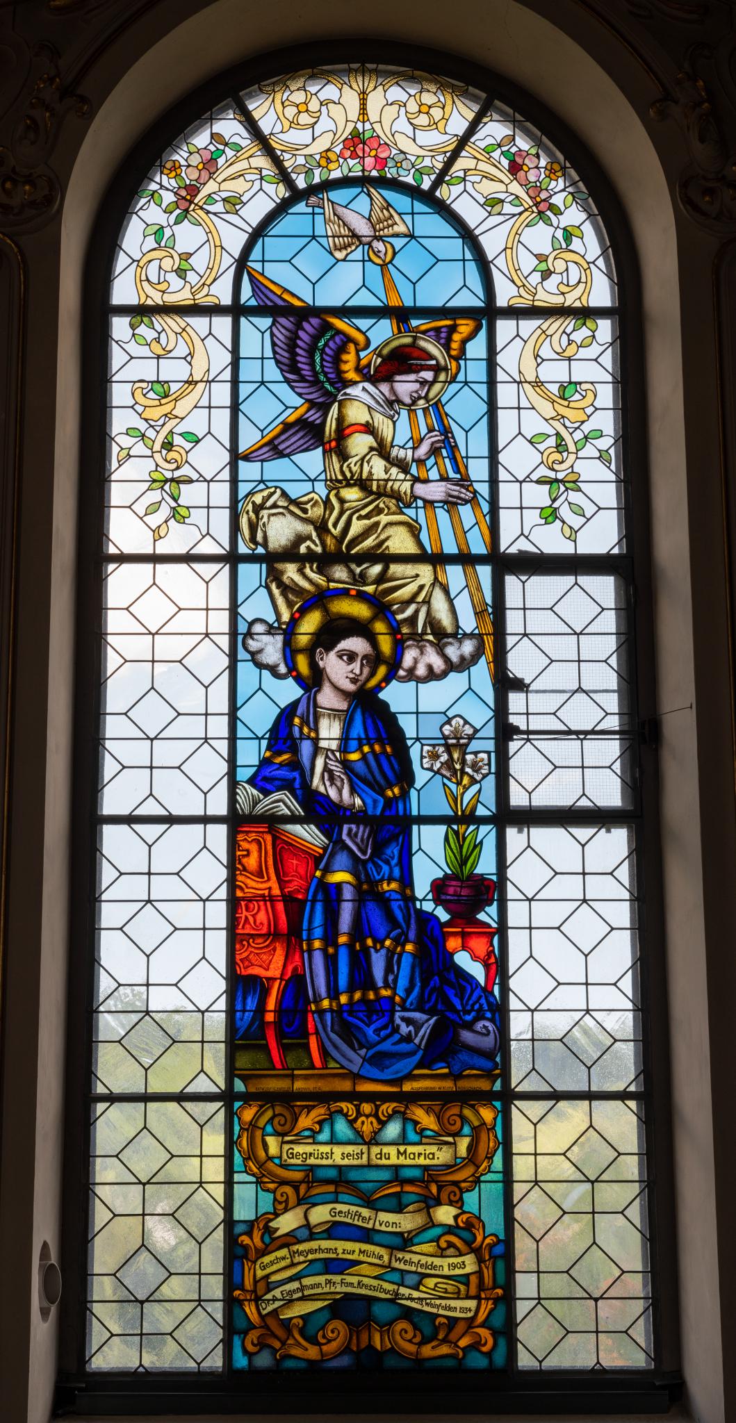Blankverglastes Rundbogenfenster mit einer entlang des Bogens verlaufenden Blumengirlande. Auf einem aus Rocaillen gebildeten Sockel kniet Maria am Lesepult mit gefalteten Händen. Über ihr schwebt der Engel Gabriel, der ihr die Geburt Christi verkündet. Weisse Lilien verweisen auf Marias Jungfräulichkeit. Zuoberst erscheint der Heilige Geist als Taube. Im Sockel erscheinen die Stifterinschriften.