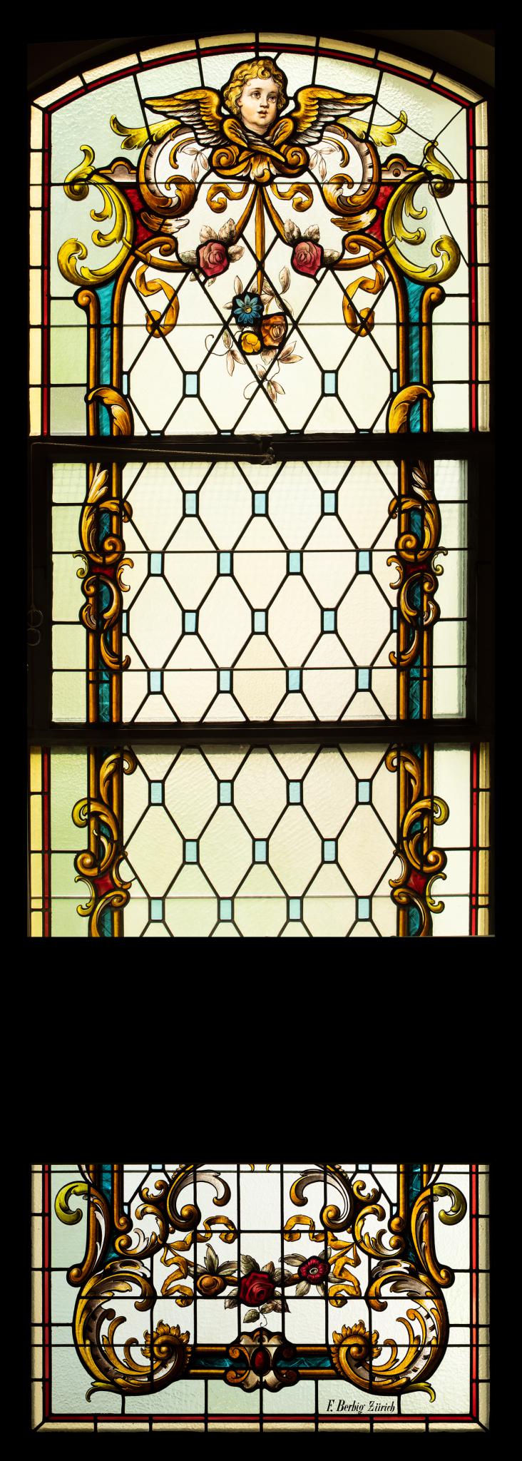 Segmentbogenfenster mit der Darstellung eines üppigen Rahmens aus Rocaillen im Neorokoko-Stil. Der Rahmen ist mit Blumengirlanden geschmückt und schliesst oben mit einem geflügelten Engelsköpfchen ab. Ausserhalb des Rahmens leicht getönte Rechteckverglasung und schmaler farbiger Zierrahmen, innerhalb des Rahmens Rautenverglasung mit hellblauen Rechtecken an den Kreuzungspunkten.