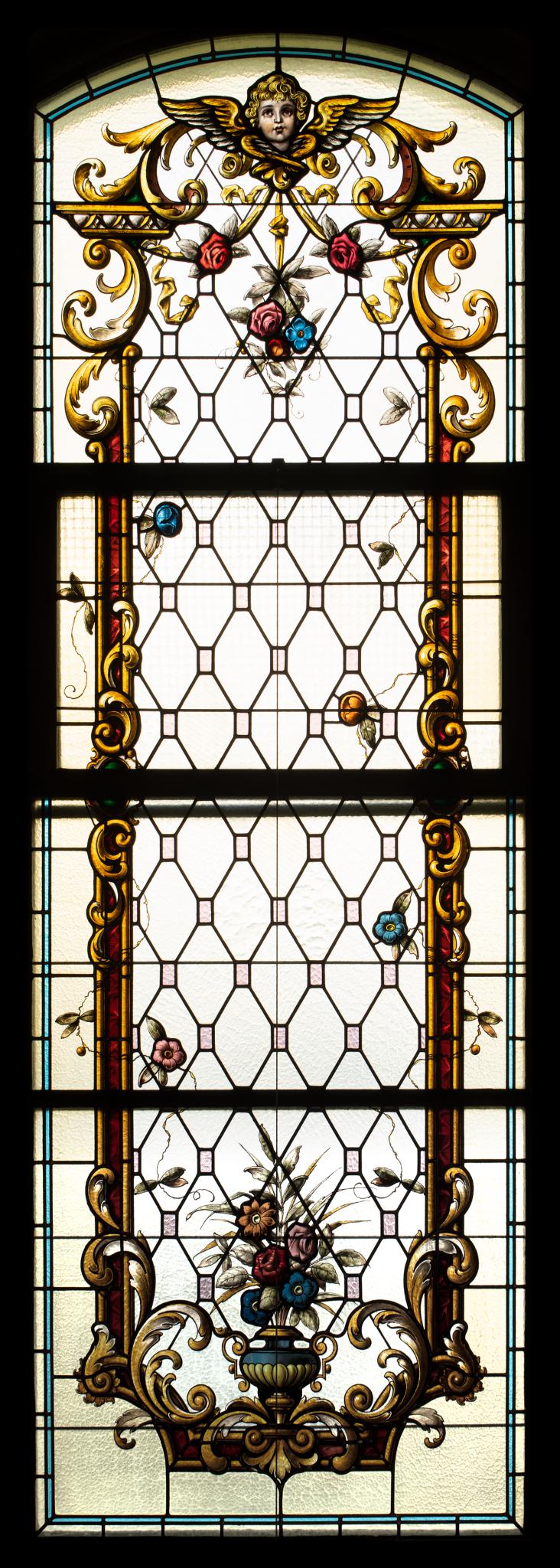 Segmentbogenfenster mit der Darstellung eines üppigen Rahmens aus Rocaillen im Neorokoko-Stil. Der Rahmen ist mit Blumengirlanden und -ranken geschmückt und schliesst oben mit einem Karnies mit Eiserstab und einem geflügelten Engelsköpfchen ab. Unten Vase mit Blumenstrauss. Ausserhalb des Rahmens leicht getönte Rechteckverglasung und schmaler farbiger Zierrahmen, innerhalb des Rahmens Rautenverglasung mit lilafarbenen Rechtecken an den Kreuzungspunkten.