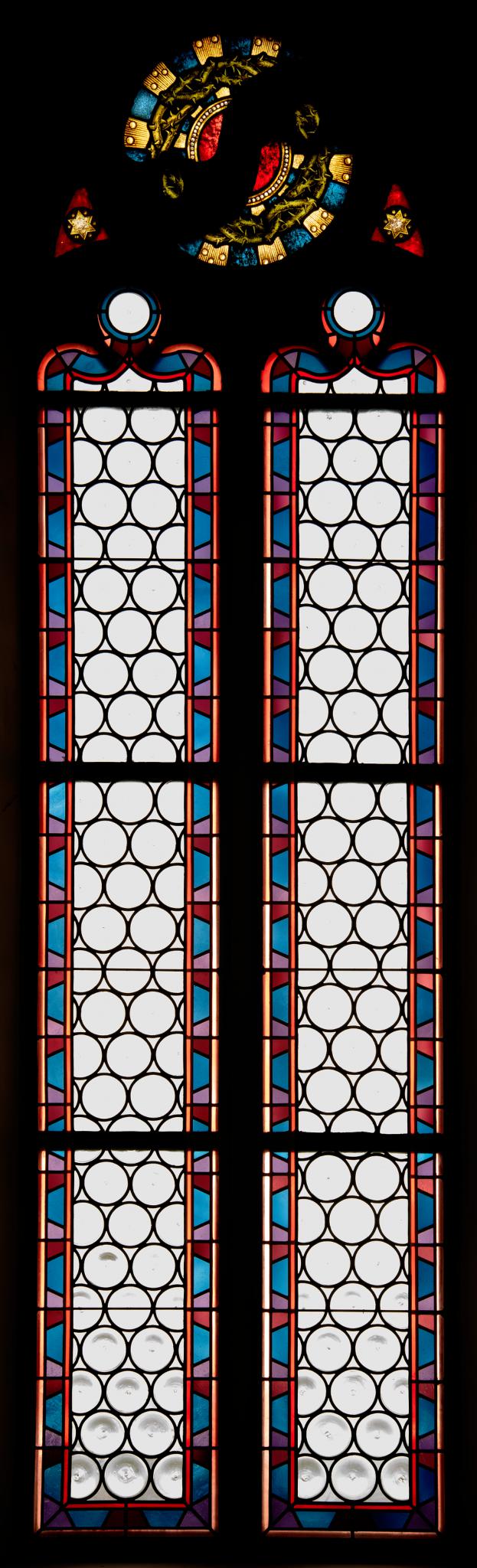 Zweilanzettiges Masswerkfenster mit Couronnement. Die Fensterflächen sind aus Butzenscheiben gefertigt, die Randverzierung aus roten, blauen und violetten Glasstücken. Im Couronnement (Fischblasen) erscheint ein Strahlenkranz mit einer Dornenkrone. In den beiden Masswerkzwickeln jeweils ein sechsstrahliger Stern.