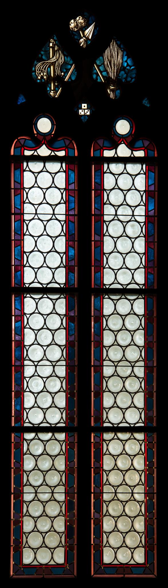 Zweilanzettiges Masswerkfenster mit Couronnement. Die Fensterflächen sind aus Butzenscheiben gefertigt, die Randverzierung aus roten, blauen und violetten Glasstücken. Im Couronnement (Fischblasen) erscheinen die Marterwerkzeuge Christi: Geissel, Lanze, Essigschwamm und eine Rute auf blauem Blattmuster. Im zentralen Zwickel Spielwürfel.